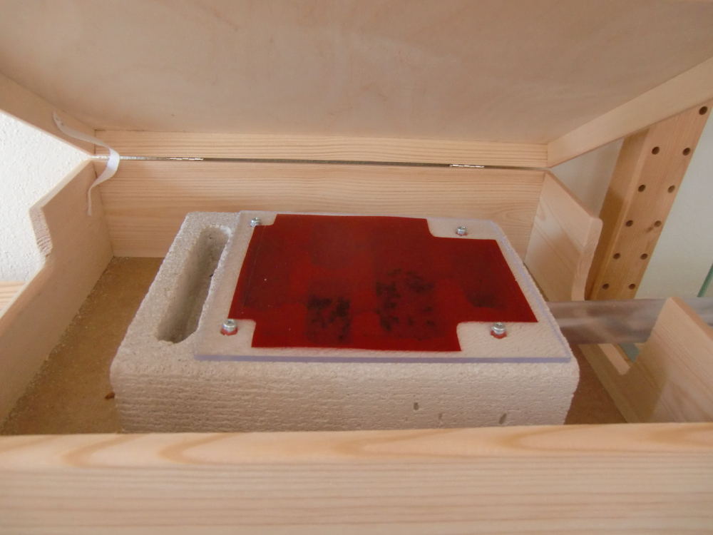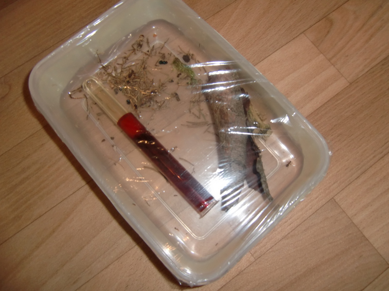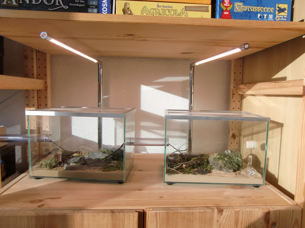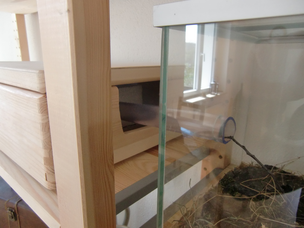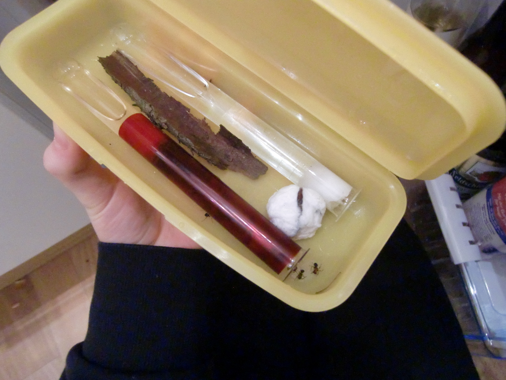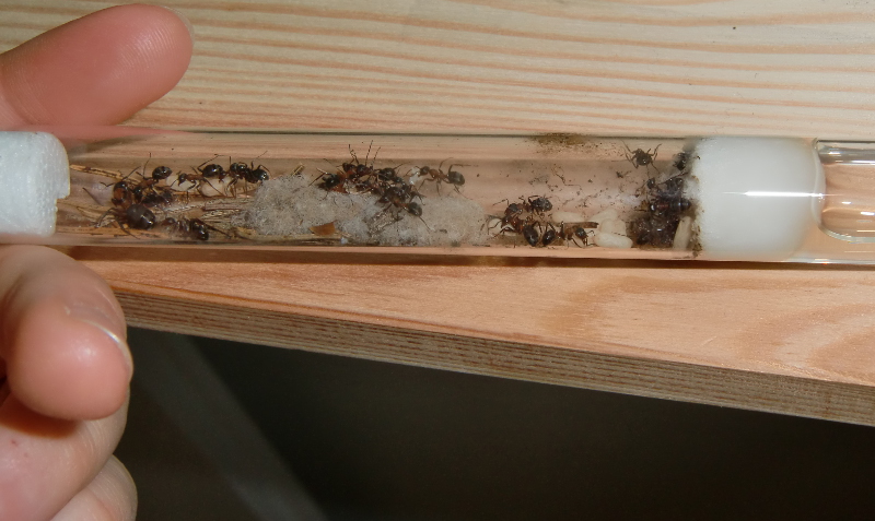 Anfang März war es dann soweit: Die Ameisen wurden aus dem Gemüsefach geholt! Zuerst legte ich das abgedunkelte Reagenzglas für einen Tag aufs Fensterbrett (innen) und dann ins Formikarium. Die Heizung war dabei natürlich ausgeschaltet.