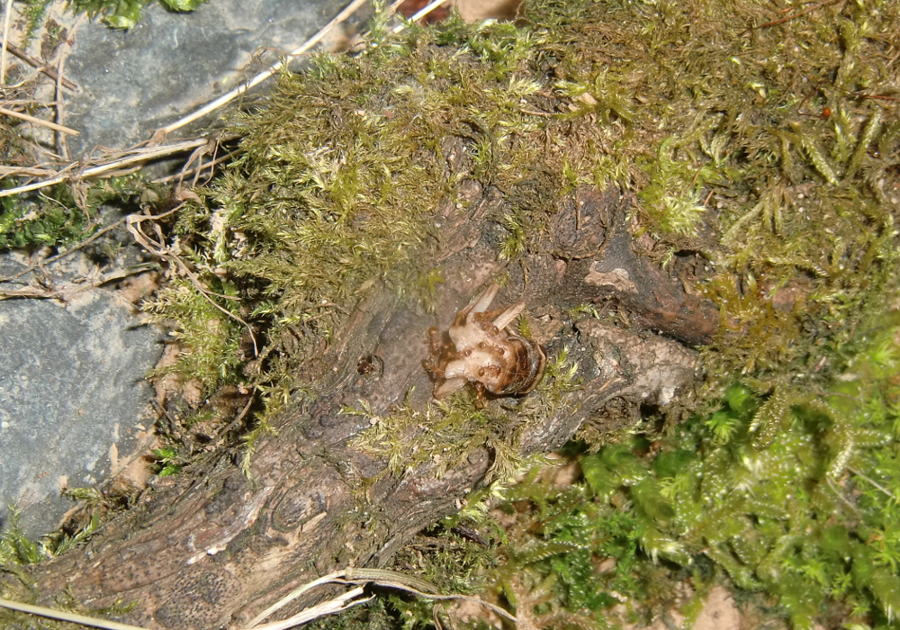 Nach einigen Minuten begannen die ersten Arbeiterinnen die Umgebung zu erkunden: Besonders ein großes Rindenstück und das Moos waren für sie interessant. Eine Stunde später saßen sie alle im neuen Nest. So ein Missgeschick, da war der Lehm noch nicht ganz getrocknet und der Spalt zwischen Rinde und Boden ein ideales Nest.