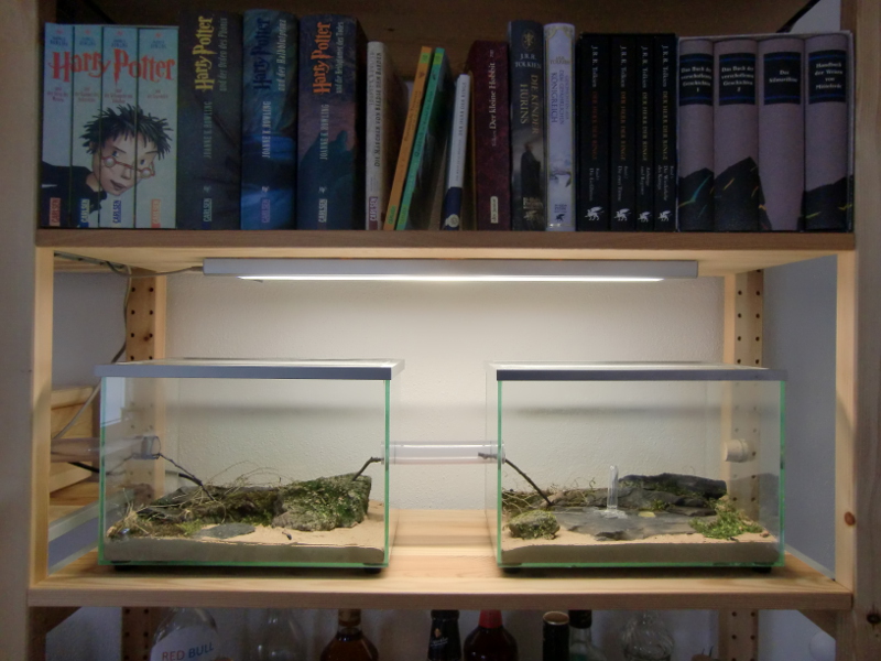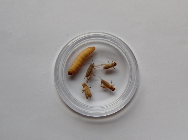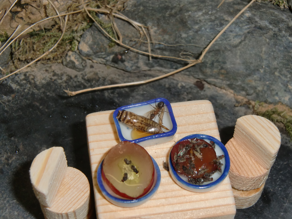 Futter: Ich bestelle mein Futter immer lebend und friere es dann sofort ein. Bei Bedarf werden einzelne Futtertiere entnommen und verfüttert. Momentan verfüttere ich vor allem mittelgroße Heimchen (ca. 15 mm lang). Zur Abwechslung gibt es subadulte Wanderheuschrecken und Wachsmaden.