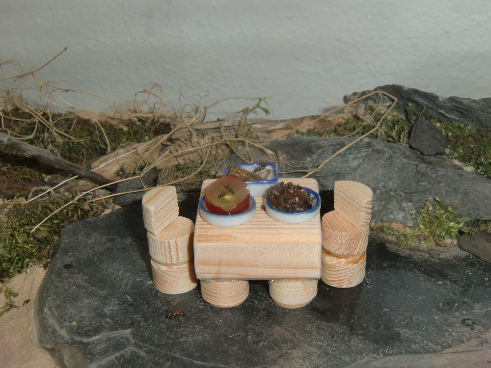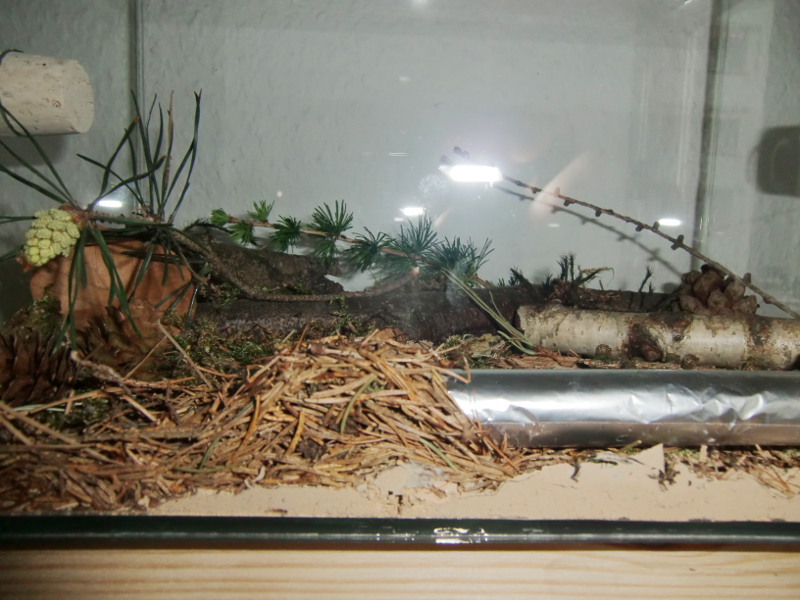Beim zweiten Dekorieren achtete ich darauf, das das nicht gleich noch einmal passieren würde. Die großen Rindenplatten ließ ich weg und verwendete dafür lieber mehr Fichtenstreu. Das Ergebnis war wieder ganz hübsch, aber die Ameisen blieben in ihrem Nest.