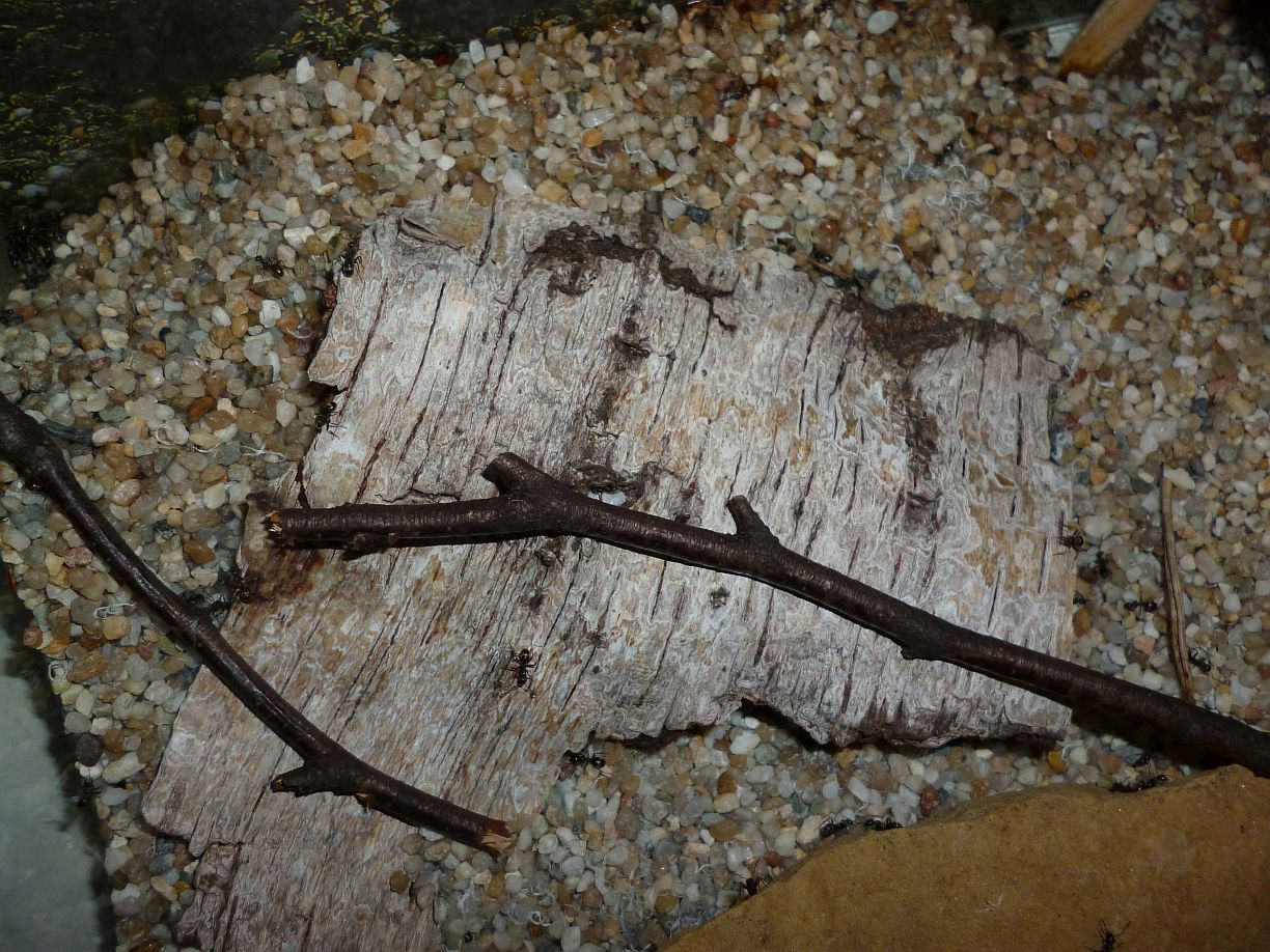 Die ursprüngliche erste Arena wurde von der Kolonie in ein Nestbecken umgewandelt. Unter einem großen Stück Birkenrinde haben sie sich ein Zweignest angelegt: