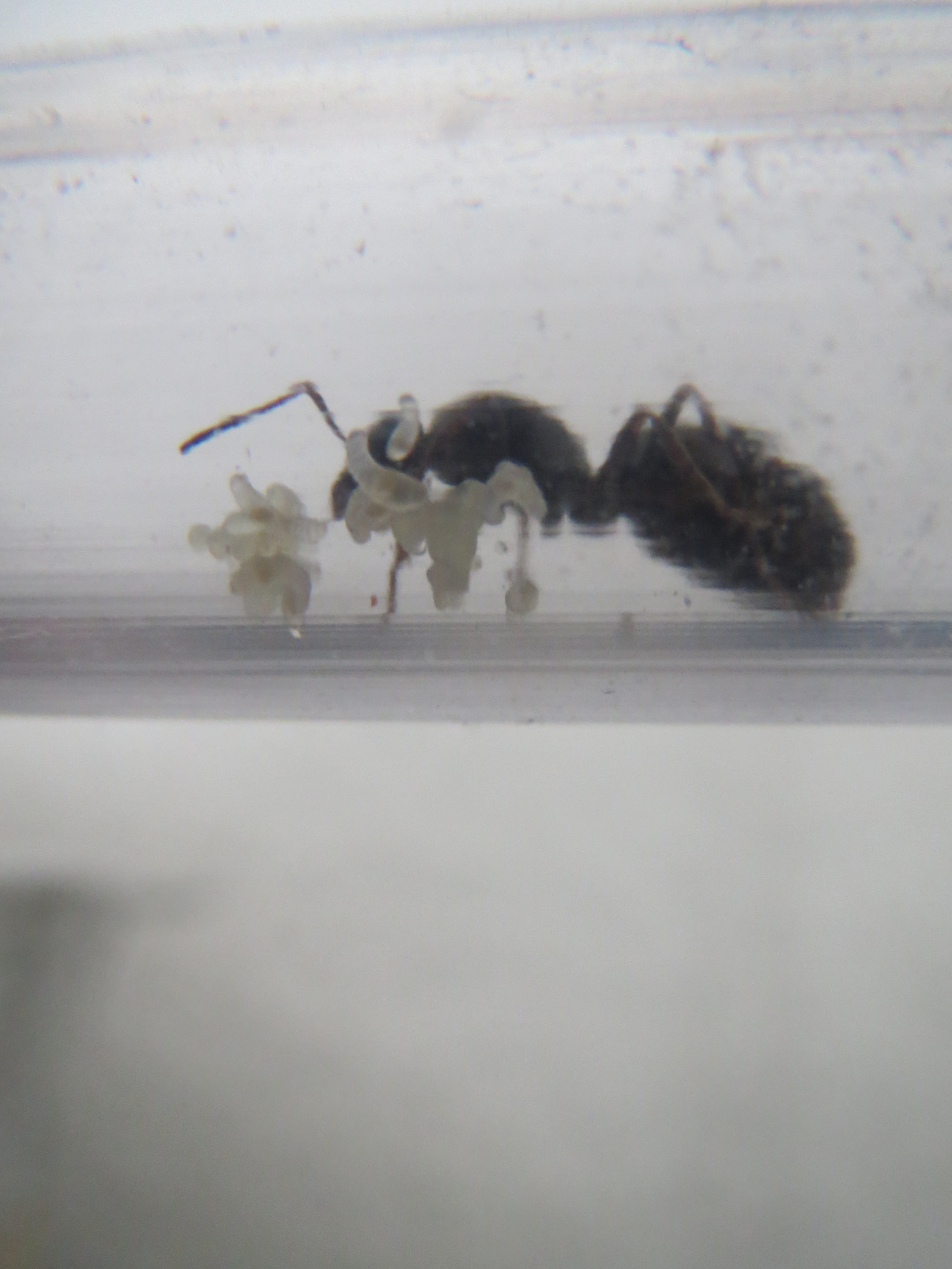 Ein Update: Die Ameisen haben sich nun in den unteren Teil des Nestes verschoben (im Schlauch). Außerdem fand ich heute eine tote Arbeiterin in der Arena. Durch Fotos im Makro-Modus konnte ich aber keine Milben an ihr erkennen. Ein weiterer mysteriöser Tod. Proteine nehmen sie immer noch nicht an. Was mich überrascht ist, dass die Eier sich immer noch nicht zu Larven entwickelt haben. Sind seit der ersten Ei-Entdeckung mehr als 2 Wochen vergangen und die Temperatur im Zimmer beträgt 21-23 Grad Celsius. Ich werde die Kolonie weiter beobachten. Dadurch, dass sie sich nie draußen blicken lassen, kann ich weiter nichts über die Milben-Situation sagen.