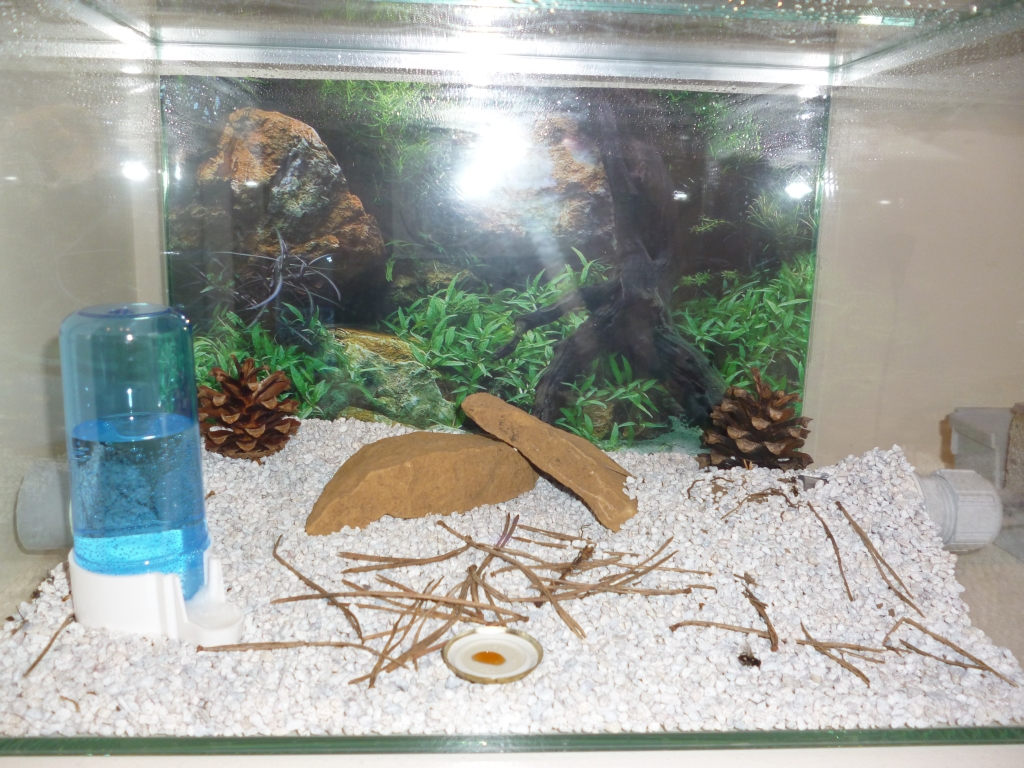 Sie können übrigens hervorragend auf Glas laufen, deshalb habe ich ihnen erstmal keine Kletterhilfen bereitgestellt. Ob das auch für die Steigungen im Schlauch gilt wird sich zeigen, sonst werde ich einen Faden hindurchziehen müssen, an dem sie Halt finden.