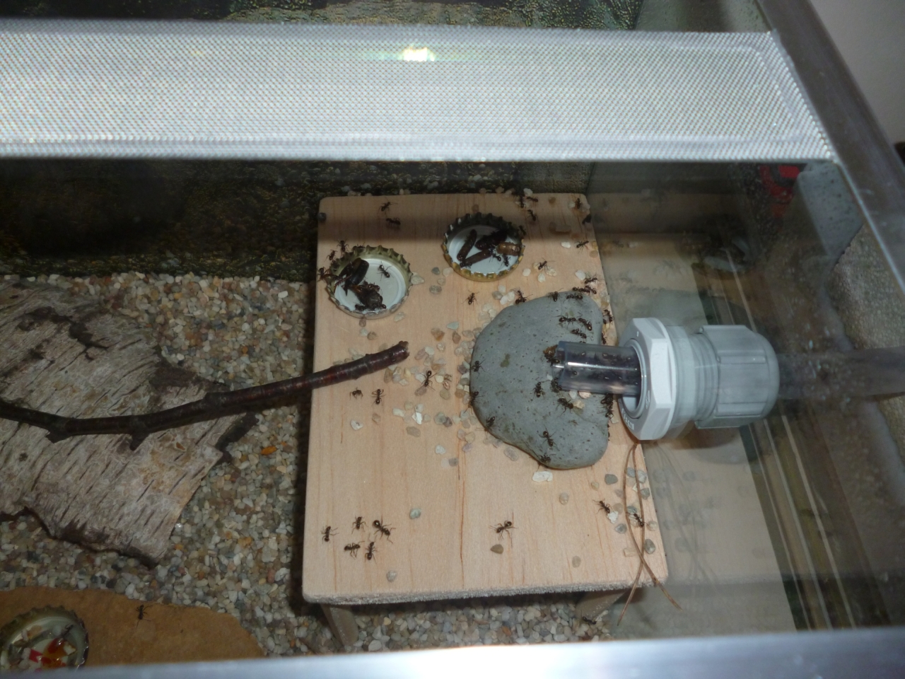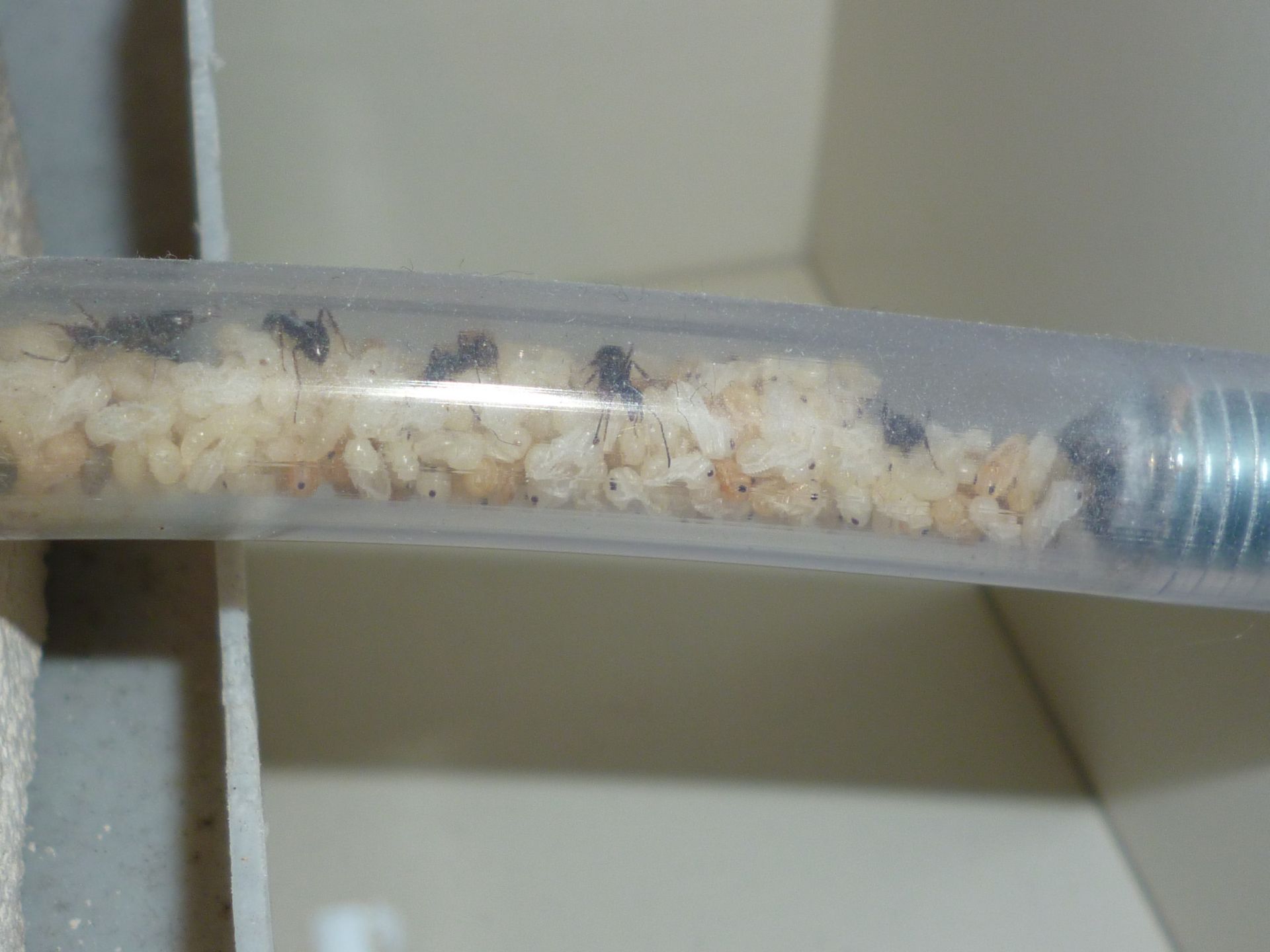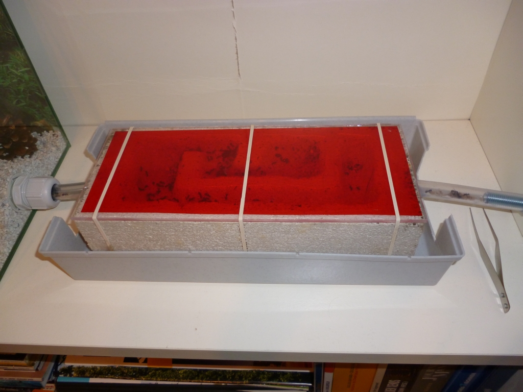 Ich erhoffe mir, dass die Kolonie nun wieder ein wirkliches Fouragierverhalten zeigt, da sie durch den Schlauch knapp zwei Meter zurücklegen muss, und nicht alles an Futter vor die Füße gelegt bekommt.