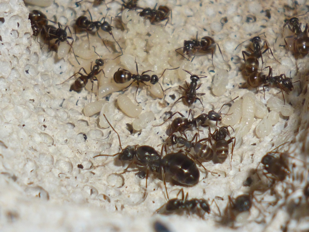 Nun leben sie seit mehr als einem Monat in einem externen Ytong-Nest, welches mit einer 30x20x20 Arena verbunden ist. Es ist reichlich Brut in allen Stadien vorhanden.