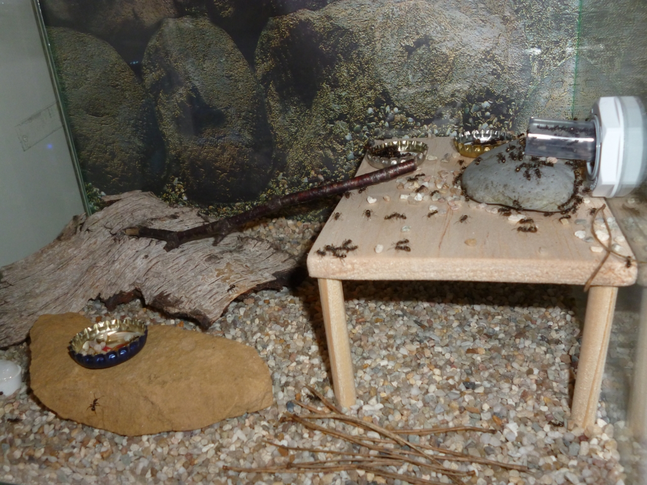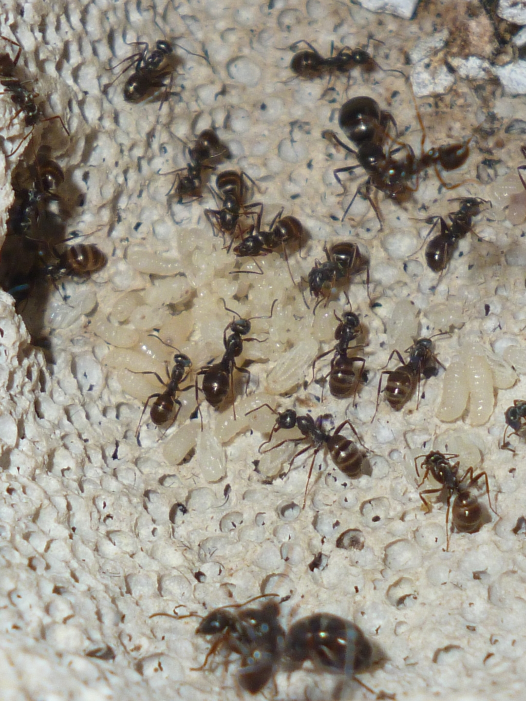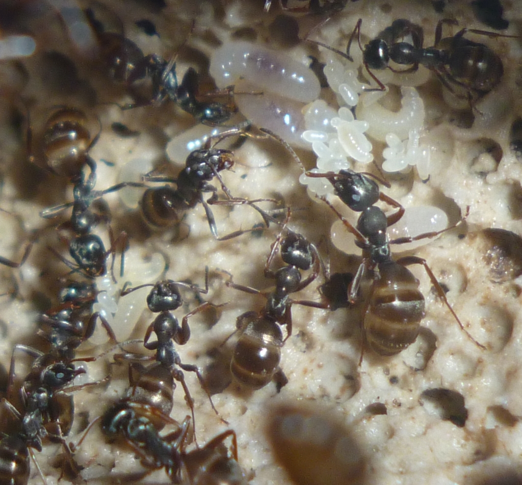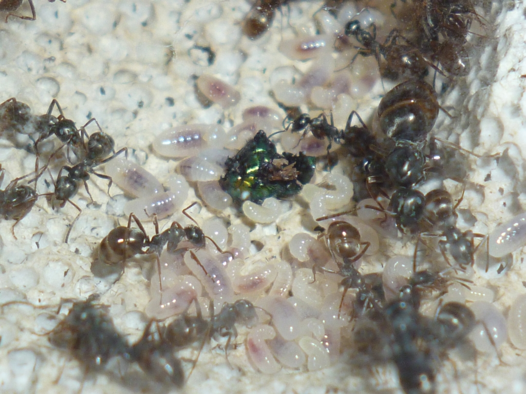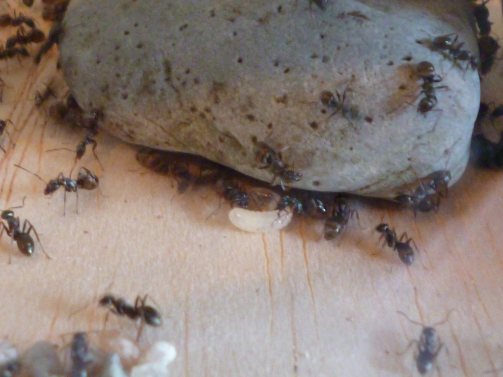 Die erwartete Bevölkerungsexplosion ist eingetreten, und die Kolonie hat die Arena mehr oder weniger zum Nestbecken umfunktioniert. In der Arena liegt ein großes Stück Birkenrinde, und darunter lagern sie neuerdings auch ihre Brut und scheinen sich generell sehr zahlreich darunter aufzuhalten.