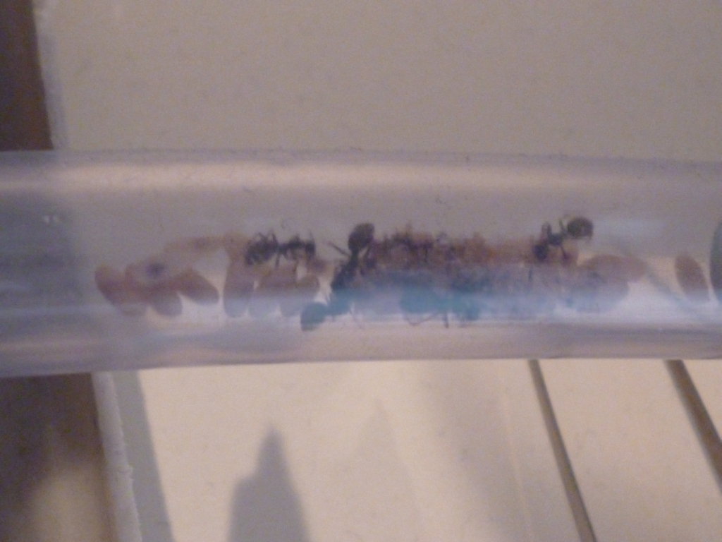 Wie bei Formica üblich überwinterte die Kolonie ohne Brut. Als die Ameisen bei mir angekommen sind befanden sie sich noch in einer Wintertraube, aufgeteilt in zwei Reagenzgläser. Es gab einige Verluste durch Transport und Winterruhe, so dass die Kolonie aktuell 40 :aa: und 4 :kk: zählt. Da sie zu Beginn der Haltung in Reagenzgläsern lebten, war es mir nicht möglich sie gründlich zu zählen und ich bin mir momentan gar nicht sicher ob es die fünfte Königin je gegeben hat :?: