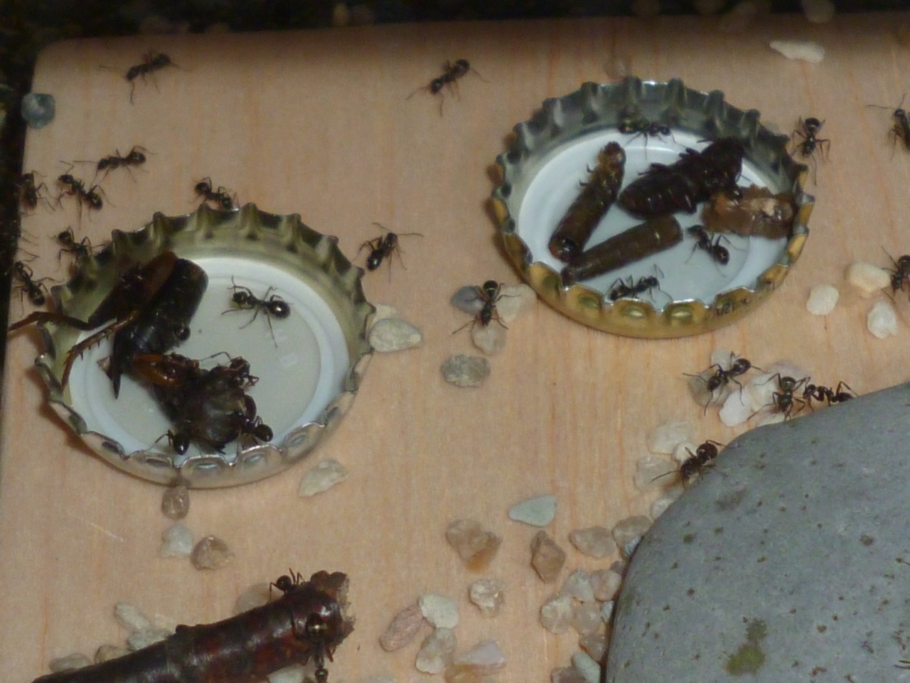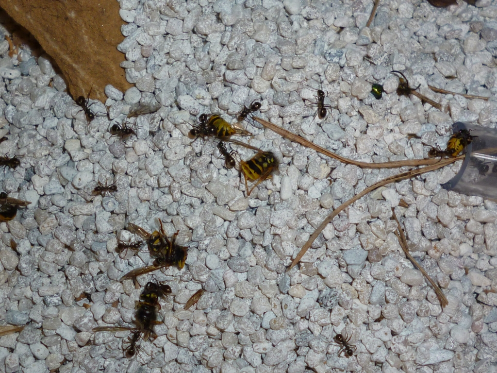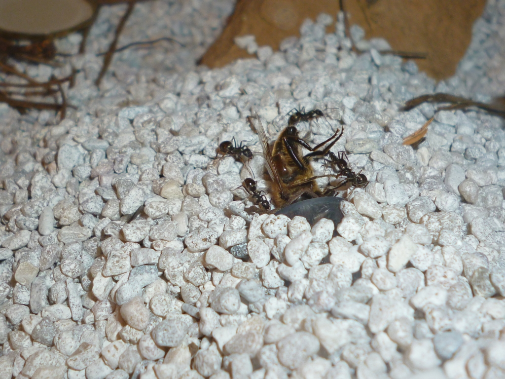 Während aus dem ersten Brutschub überwiegend kleine :aa: geschlüpft sind, so haben sie sich scheinbar mit den späteren Generationen mehr Zeit gelassen und vermutlich die einzelnen Larven besser versorgt. Jedenfalls sind zuletzt viele große :aa: geschlüpft, die sich nun auch regelmäßig in der Arena zeigen, z.B. beim Abtransport von Futtertieren. Gerade in dieser Hinsicht bin ich gespannt, welche Entwicklung die Kolonie im nächsten Jahr nehmen wird, und ob vlt noch größere :aa: entstehen. Mein Ansatz bleibt weiterhin, ihnen täglich frische Futtertiere in großer Anzahl zur Verfügung zu stellen.
