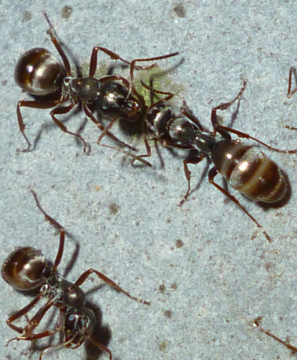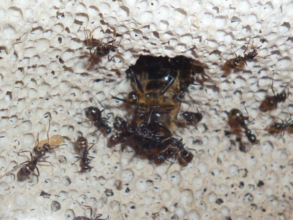 Die Drohnenbrut erfreut sich gleich großer Beliebtheit, und die Arbeiterinnen zerteilen das Futter vor Ort und laufen mit kleinen Stücken zwischen den Mandibeln heim zum Nest.