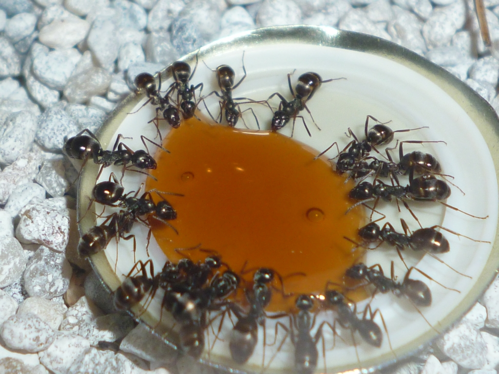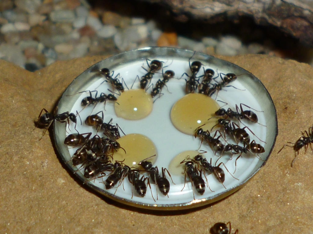 Seitdem habe ich in regelmäßigen Abständen neuen Honig angeboten, um das neue Becken als langfristige Nahrungsquelle bei der Kolonie zu etablieren. Während sich im alten Becken massenweise Arbeiterinnen auf das Futter gestürzt haben, geht es jetzt gesitteter zu. So sieht es aktuell aus: