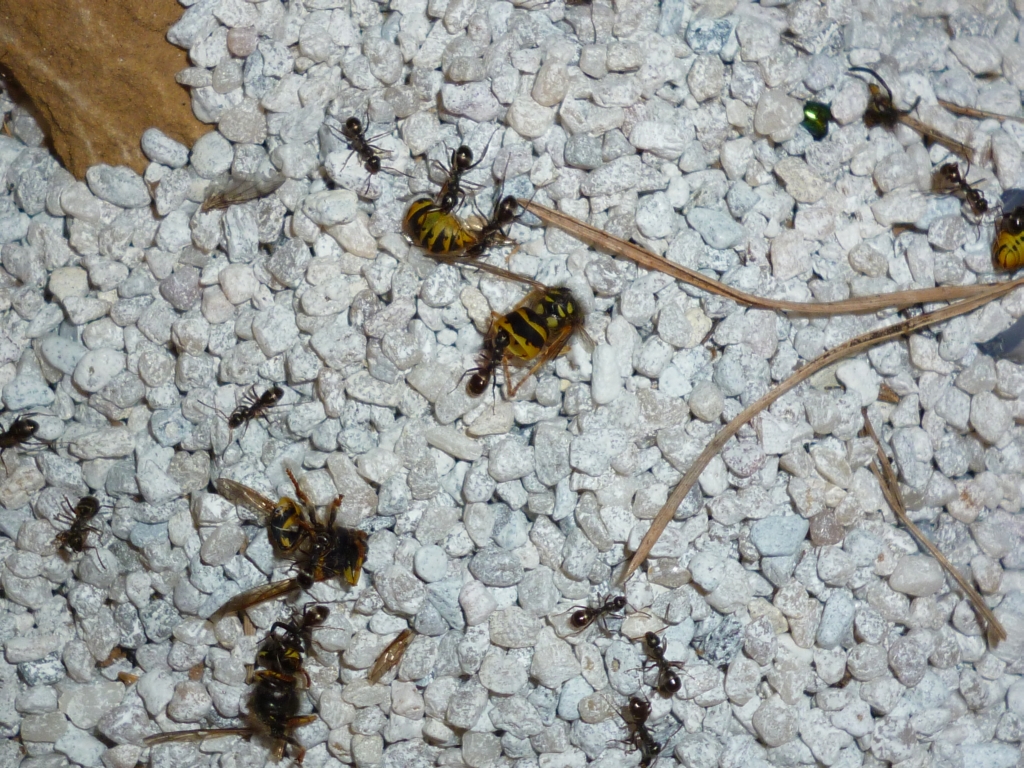 Heute gab es als besonderen Festschmaus eine Portion zerschnittener Wespen. Auf den Bildern lassen sich die Größenunterschiede zwischen den :aa: gut erkennen. Nach etwa einer Viertelstunde war der Zauber schon wieder vorbei, und die Ameisen hockten mit der Beute im verschlossenen Nest.