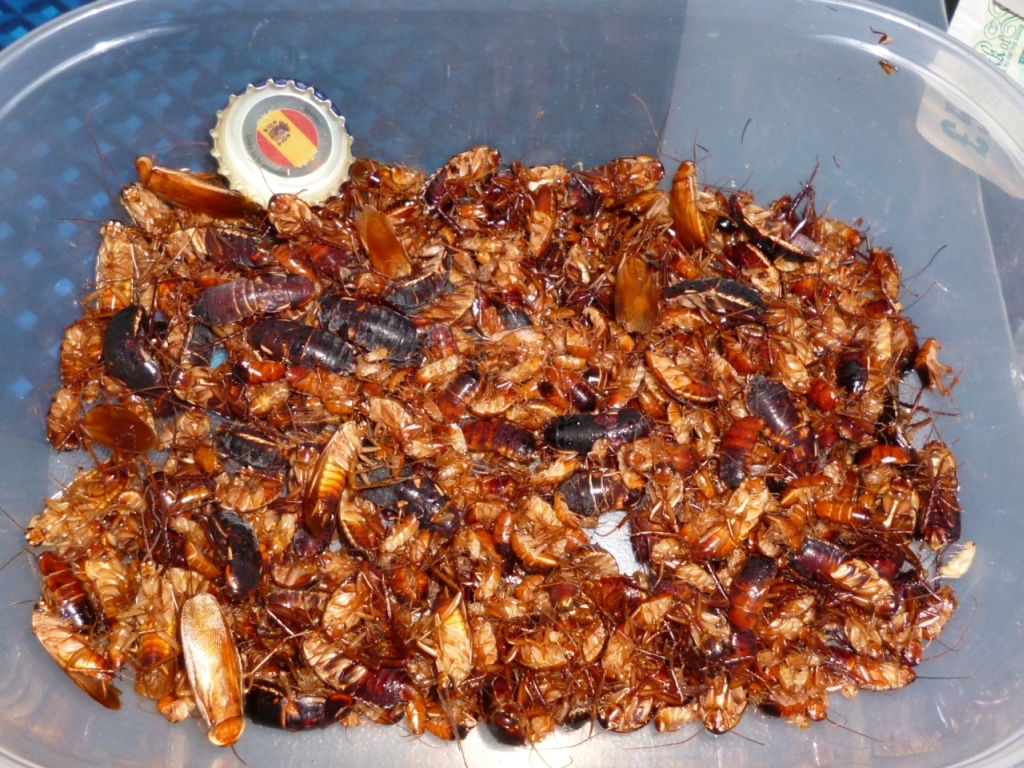 Dieses Jahr habe ich weder die Zeit ständig Futtertiere zu fangen, noch möchte ich fast täglich Insekten töten. Von daher habe ich bei https://www.myants.de/ Schokoschaben bestellt. Da ich noch keine Erfahrungen mit den Tieren hatte, habe ich die gemischte Version bestellt. Dementsprechend waren Schaben in allen Größen dabei. Es waren auch einige Ootheken dabei und Futter Pellets. Die Insekten machten einen guten wohlgenährten Eindruck, jedenfalls verglichen mit den Futtertieren die man hier beim lokalen Zoohandel so kaufen kann. Dort findet sich meist kein Futter in den Boxen und vielen Tieren fehlen Gliedmaßen.