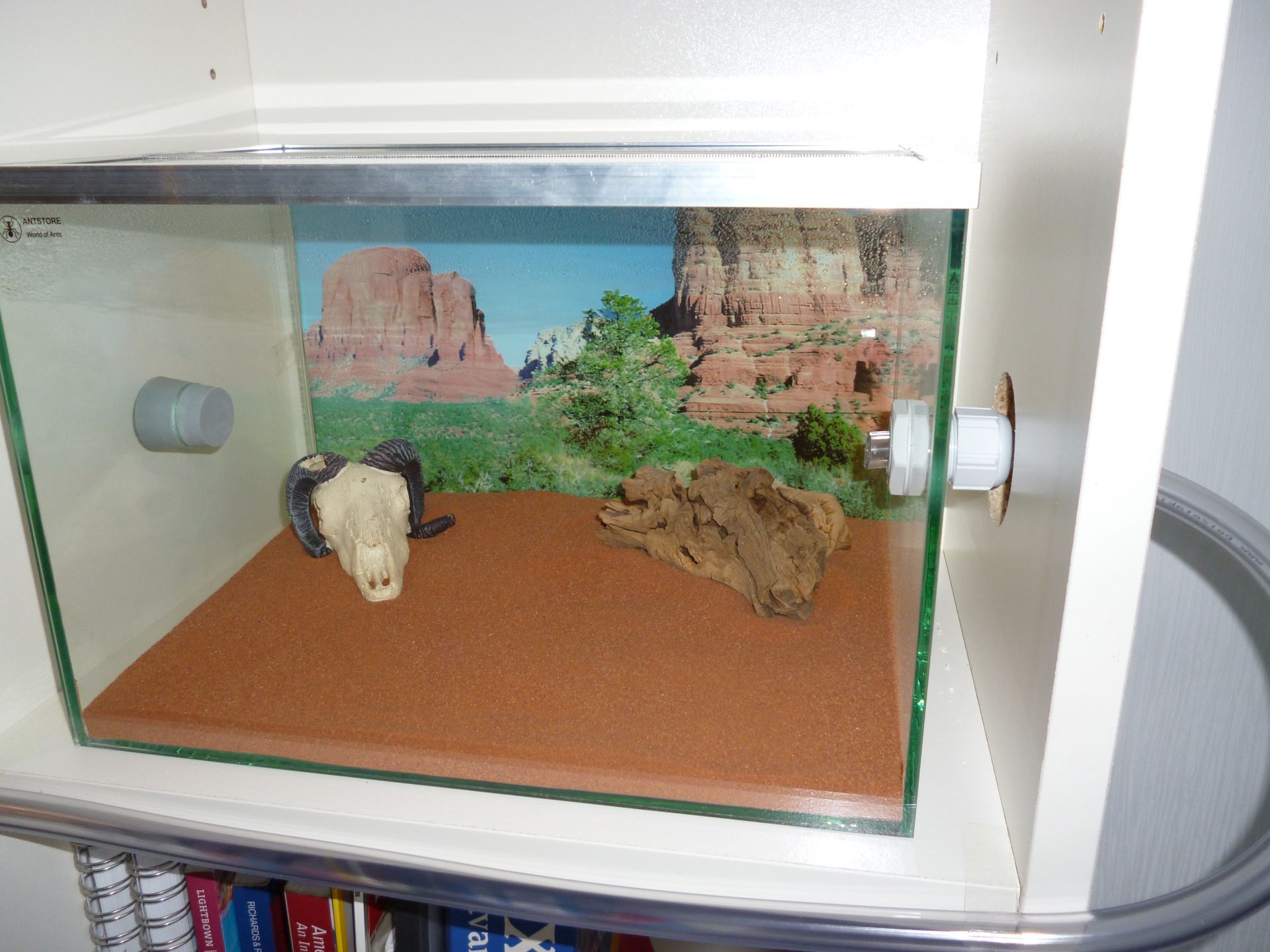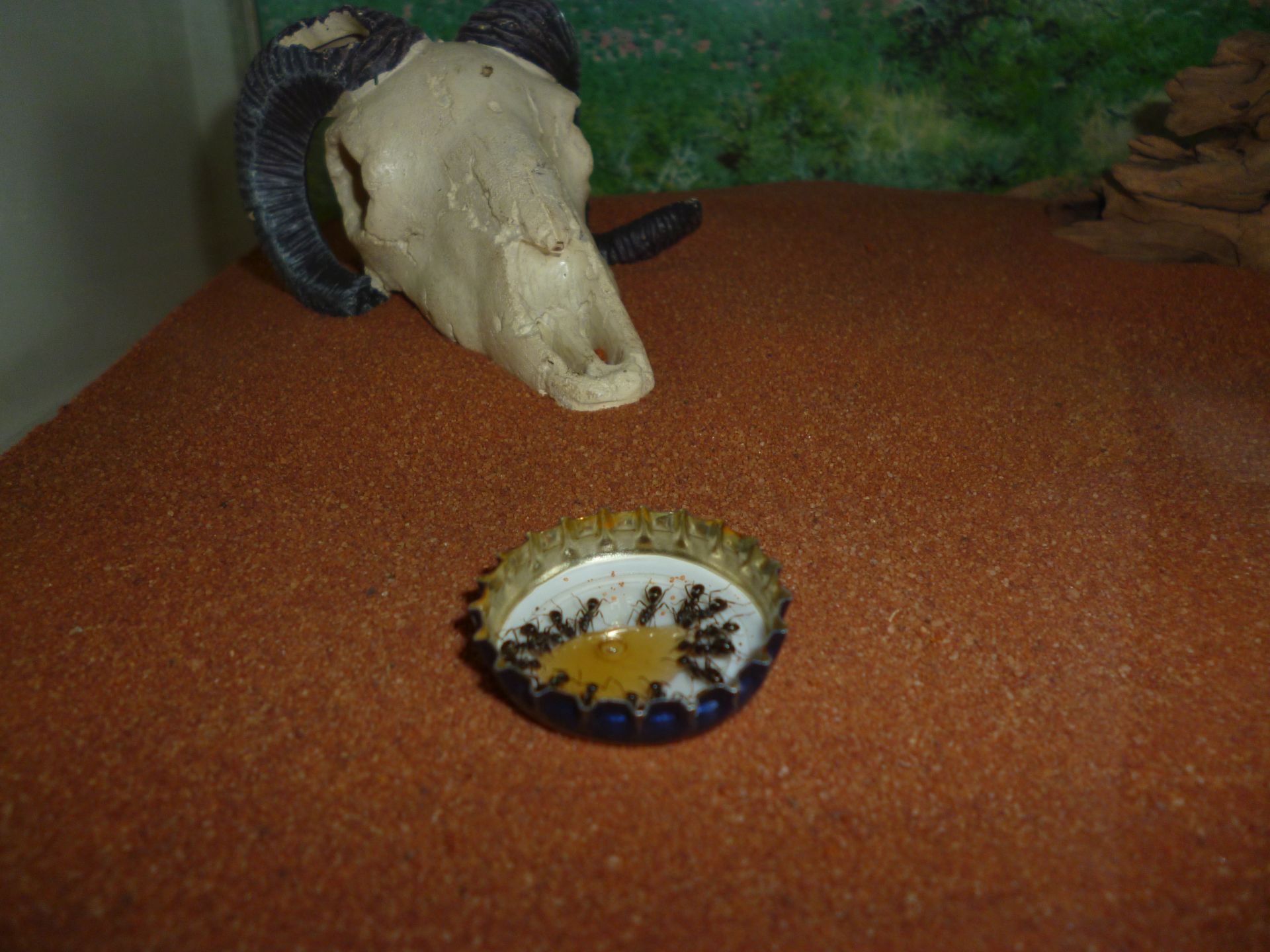 Ich hatte noch im Zoofachgeschäft vorm Regal gestanden und überlegt ob ich nicht doch besser roten Kies nehme anstelle von Sand. Letztendlich stellt ein Paraffinölstreifen aber so oder so kein dauerhaftes Hindernis für Formica fusca-Kundschafterinnen da, wie ich schon desöfteren feststellen durfte. Ich kann jedem der vorhat diese Art zu halten nur dazu raten, ebenfalls einen Deckel zu benutzen.