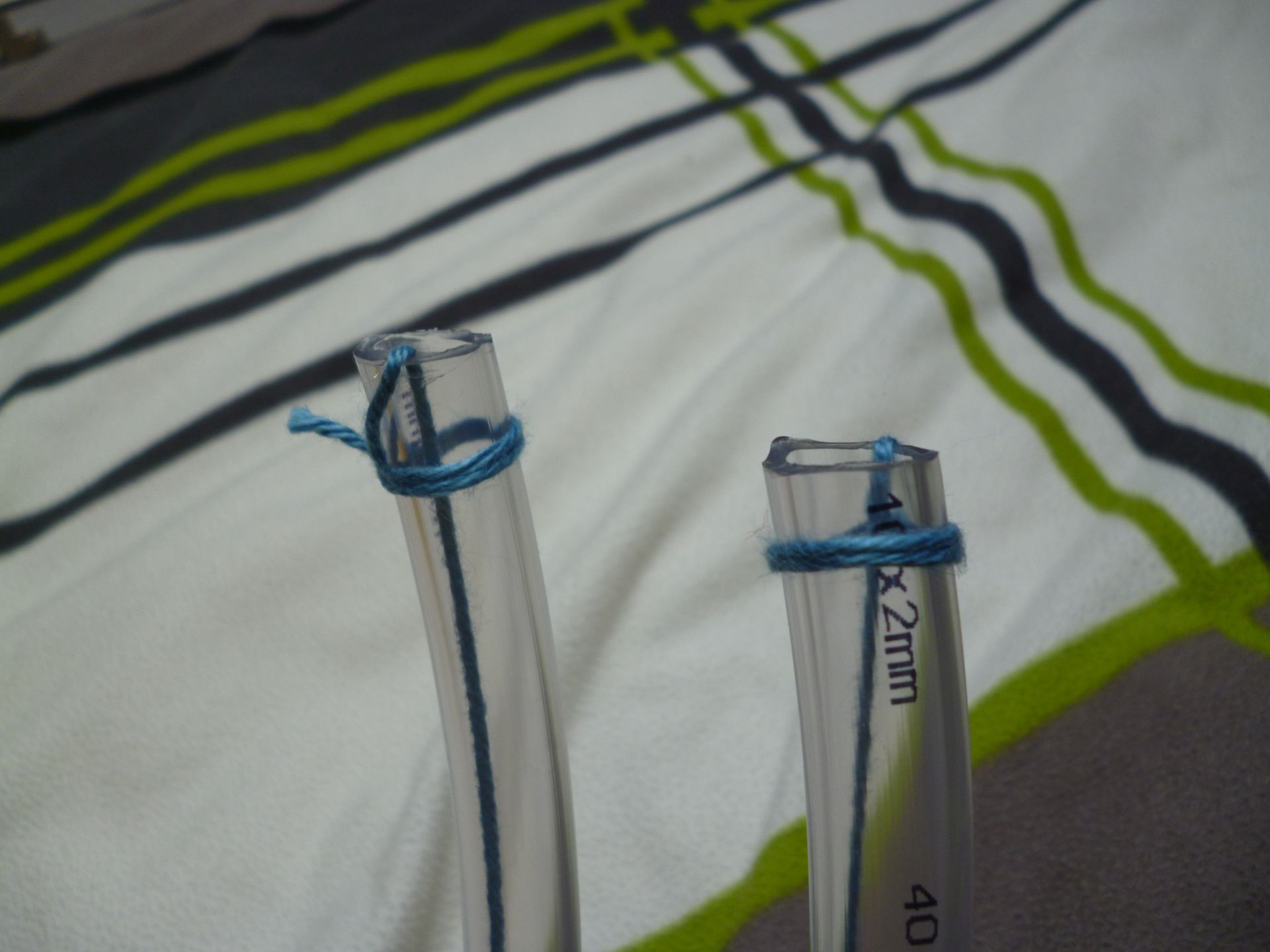 Mit weiblicher Unterstützung kam ein zweiter Versuch zustande, bei welchem der Wollfaden einfach am Ende des Schlauchs festgeknotet wurde: