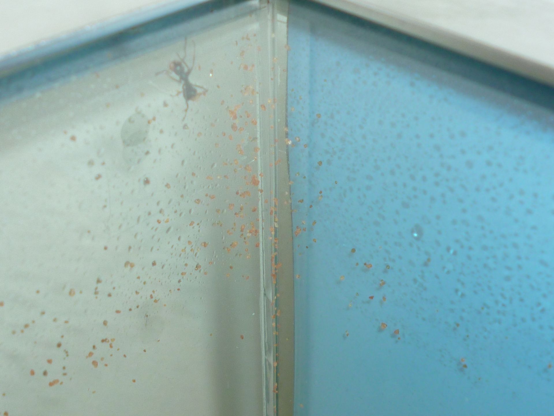 Hatte ich zuletzt noch die Formica fusca dafür gelobt, wie gut sie an Glas laufen können, so muss ich meine Aussage etwas abdämpfen. Im "vollgetankten" Zustand tun sie sich teilweise schwer an Glasflächen empor zu klettern. Auf Dauer werde ich wohl nicht umhin kommen, eine Kletterhilfe zu den Schlachausgängen zu legen. Dies stellt aber auch keinen großen Aufwand da, und daran soll es nun wirklich nicht scheitern.