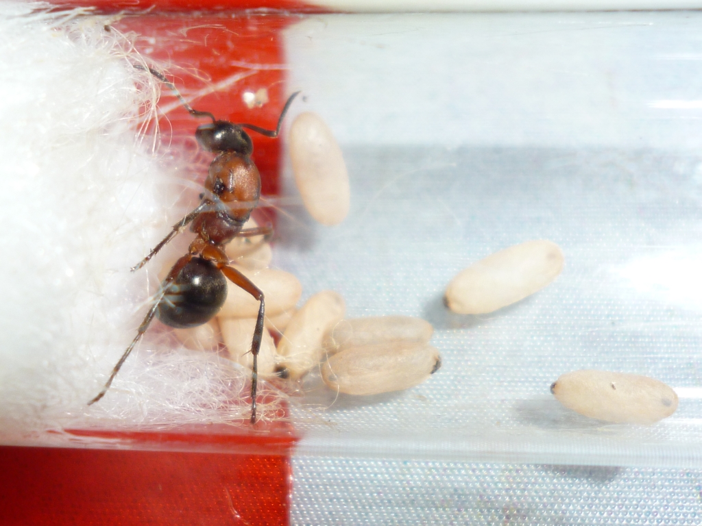 Die Königin hatte leider ein Bein verloren und machte einen geschwächten Eindruck. Ich habe sie in ein RG gesetzt und ihr etwa 10 Serviformica Puppen aus meiner Formica fusca Haltung direkt ins RG gegeben.