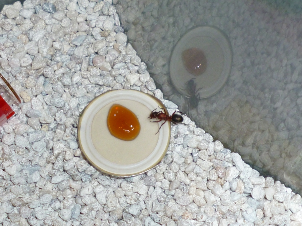 Während die verletzte Königin mit den Puppen im RG saß, lief die zweite Königin umher und bediente sich am bereitgestellten Honig. Hervorzuheben ist die gute optische Orientierung von Formica sanguinea. Auf dem folgenden Foto sieht man die Königin am Honig, sie weicht jedoch zurück wegen der Belichtung durch die Kamera: