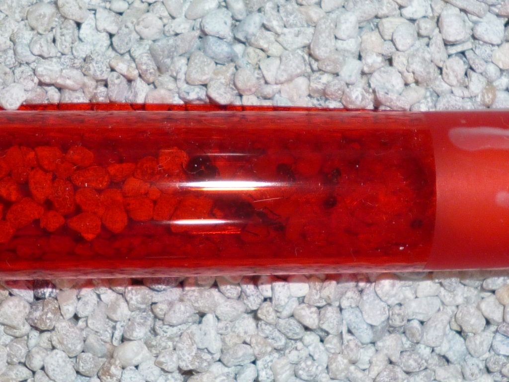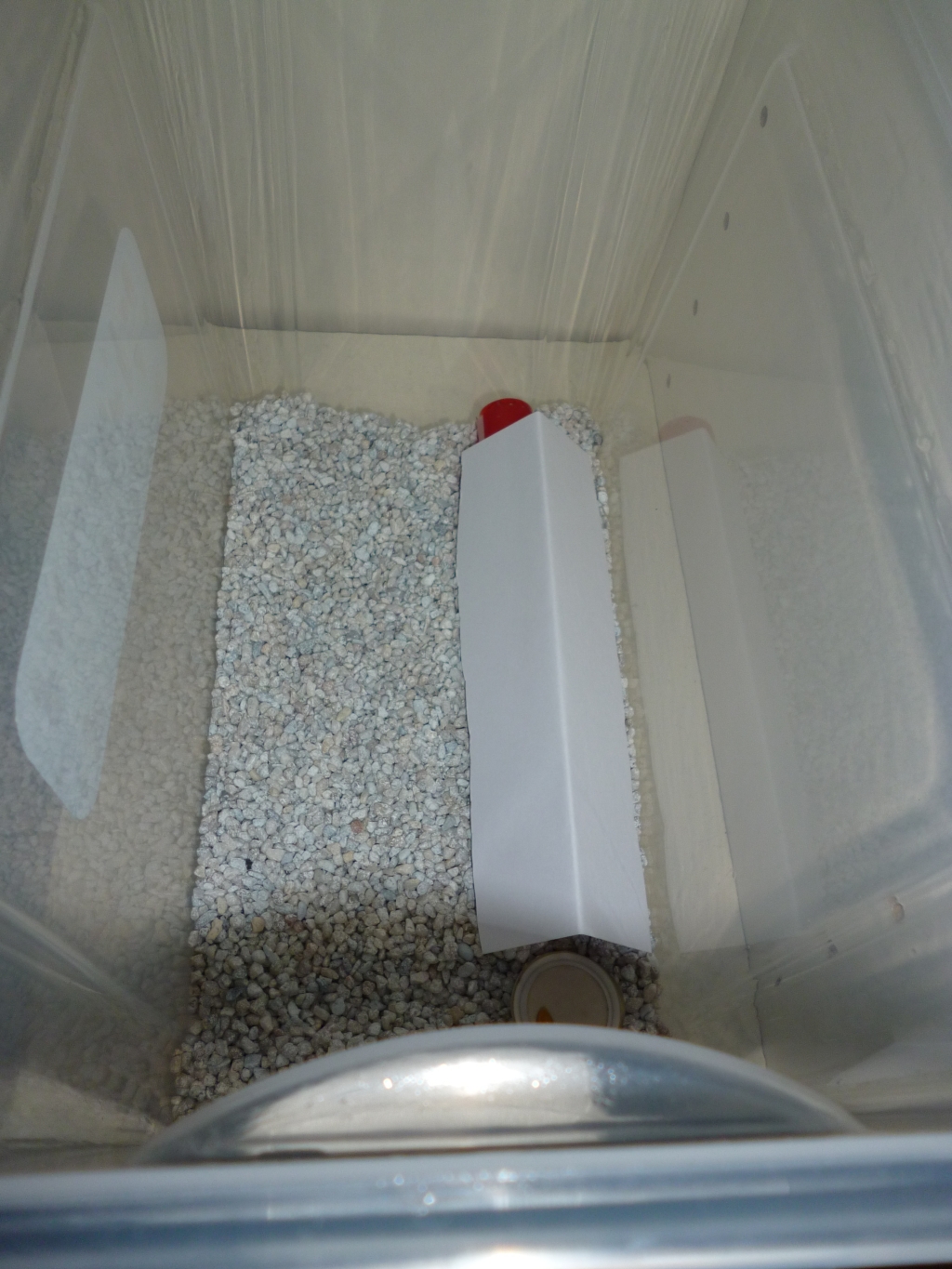 Abends habe ich mich damit beschäftigt, den beiden ein kleines Aufzuchtbecken einzurichten. Ich habe es bewusst simpel und übersichtlich gehalten. Eine einfache Plastikbox, als Bodengrund heller Aquarienkies und Paraffinöl als Ausbruchschutz. Das RG wurde mit Roter Folie umwickelt, welche mit Tesafilm und Gummibändern fixiert wurde, und anschließend in die Arena gelegt. Dann wurde die zweite Königin hinzugegeben, in der Hoffnung, dass die beiden sich zusammen schließen.