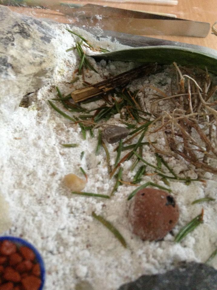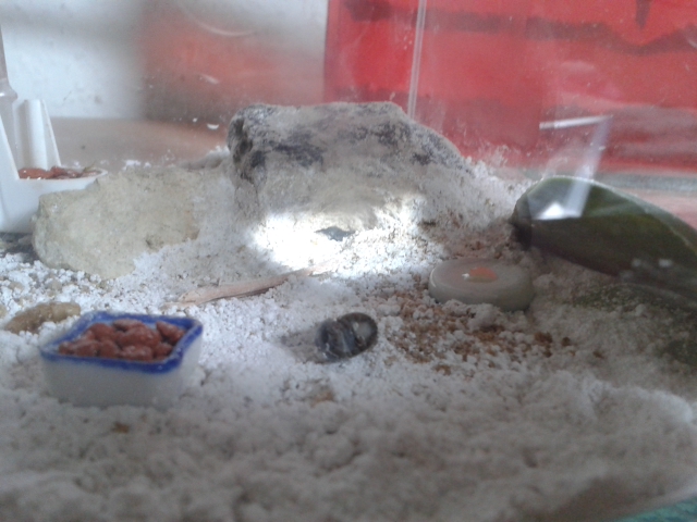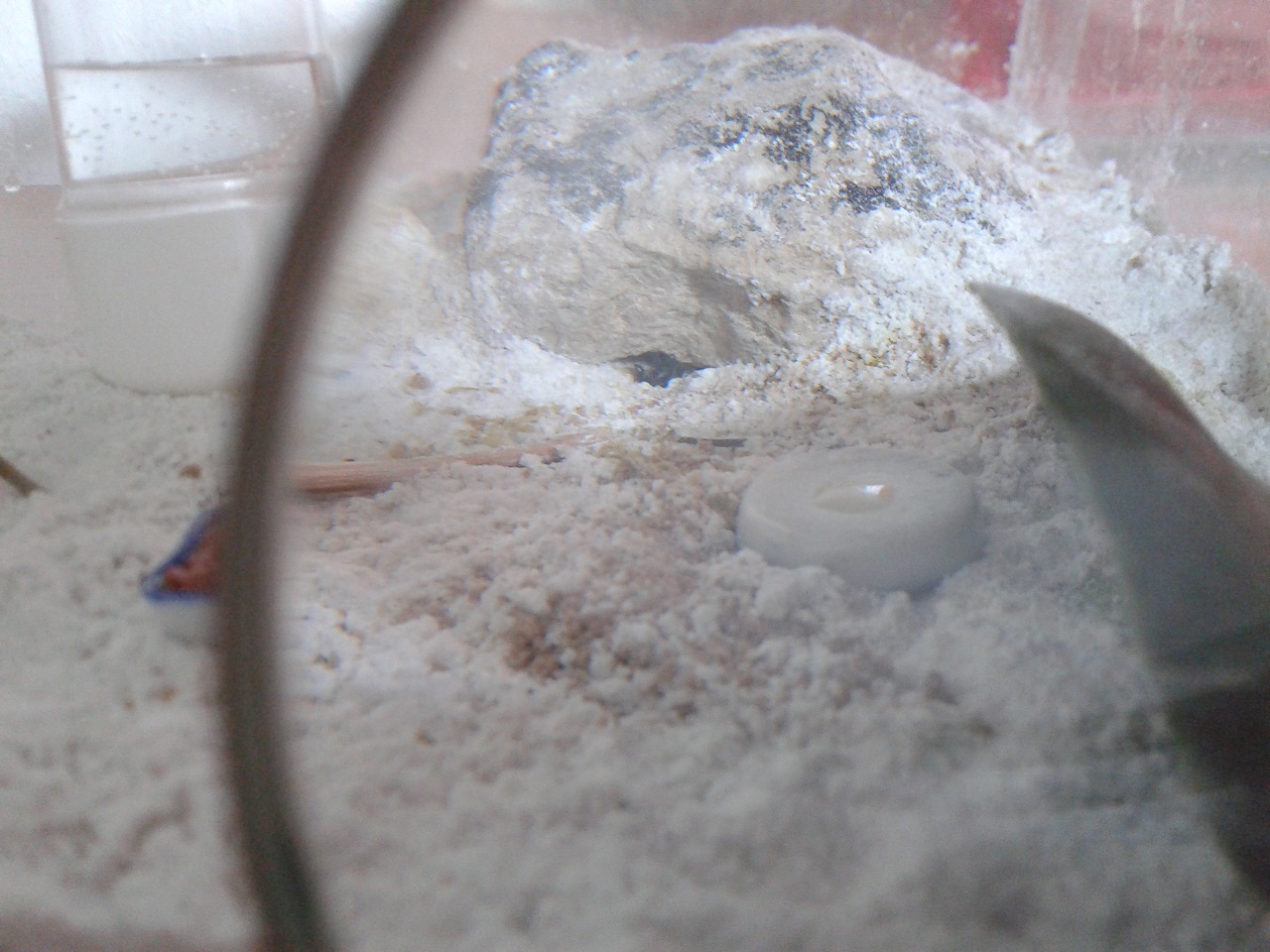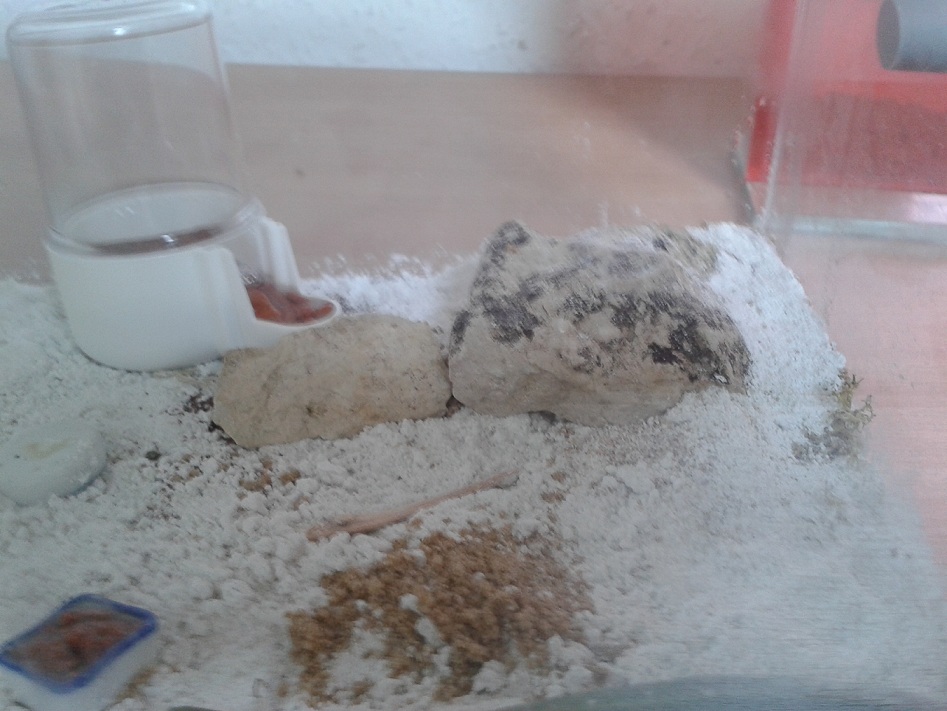 Ich dachte mir ok ich werde jetzt mal ein kleines zuhause (nicht das Nest) für meine kleinen bauen. Somit nahm ich einen stein und machte ihn von innen hohl. Dann legte ich etwas von einer etwas feuchten (nicht nassen) Sand-Lehm Mischung in die Ecke der Arena.