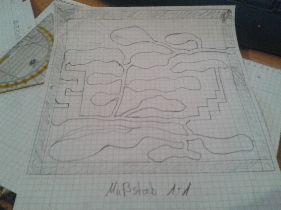 Alles war übertragen und ich fing an zu fräsen, dann viel mir auf das es gar nicht mal so leicht ist wie ich dachte. Ok am besten in mehreren schritten vorgehen (dachte ich mir). Zuerst habe ich die ganzen Linien nachgezogen also die umrisse der Kammern, keine so gute Idee. Weil ab dem Punkt wo ihr eure Kammern vorgefräst (sag ich mal) habt, dann fällt euch auf oh nein ich hätte doch erst die Wege reinmachen sollen. Ich hoffe der Tipp hilft vielen weiter macht am besten erst die Gänge dann die Kammern.