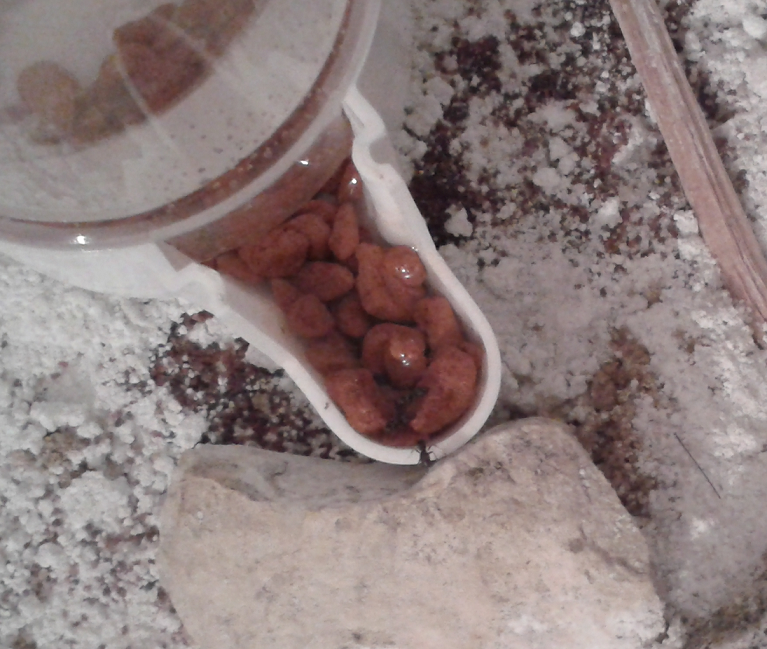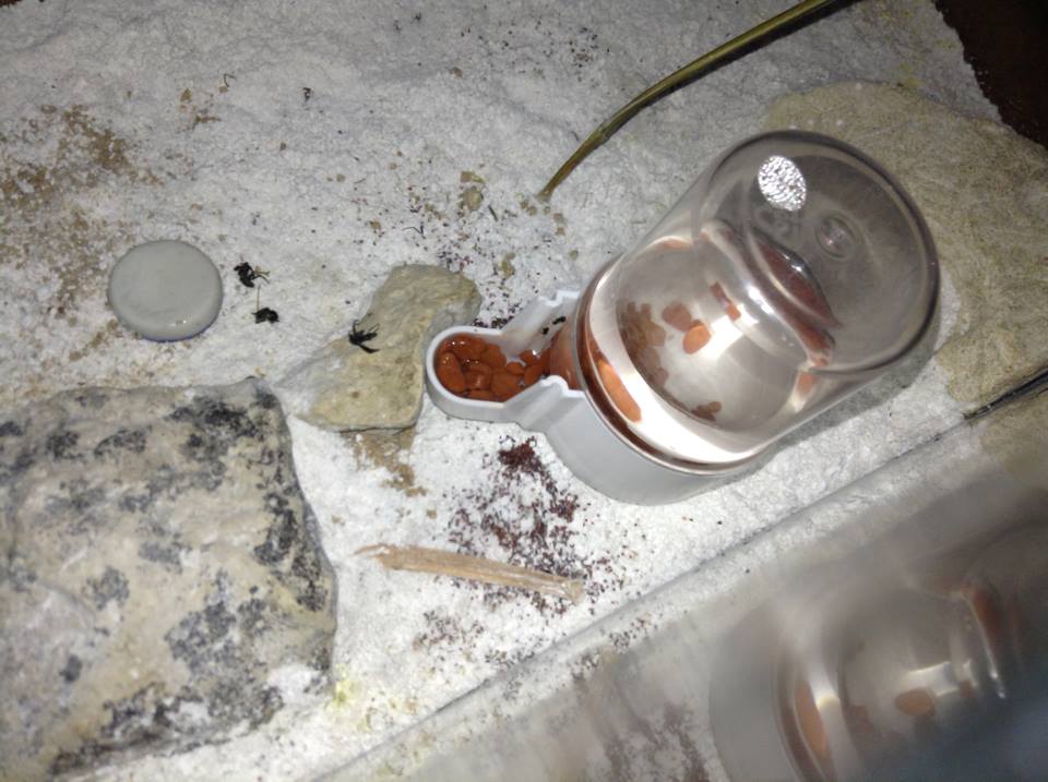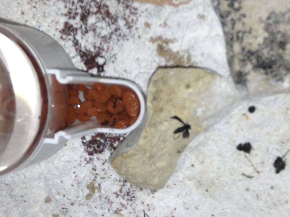 Meine Ameisen habe schon 2 Tage nichts mehr reingeholt (an essen) aber auf den Müll war immer etwas zu finden. Weil meine Ameisen immer nur im Nest sind (95% des Tages und der Kolonie) was eigentlich verständlich ist, biete ich ihnen gleich eine Spinne einen Marienkäfer eine Fliege (Sie lieben Hausfliegen) und frisches Zucker-Wasser. Dazu aber mehr in meinem Nächsten bericht