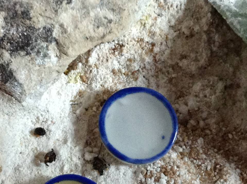 Hier sieht man das Imkwasser da es Farbe enthält damit man sieht wie voll der Napf war, der Zuckerwasser Napf war genau so voll.