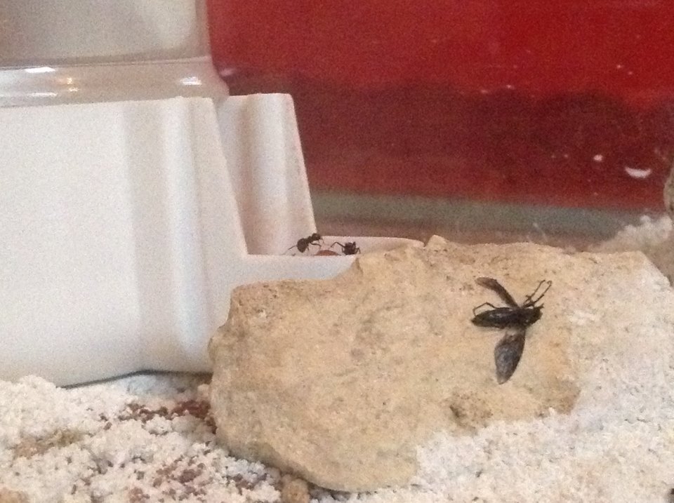 Eine halbe stunder dauerte es wo die erste Ameise die Fliege fand und direkt anfing dran zu nagen und zu zerren. Sie ging ins RG und holte (so wie es aussah) Verstärkung bis so 4-6 Ameisen an der Fliege waren, sie haben dran geknabbert und gezehrt. (Dann musste ich Leider zur Fahrschule) Ich schaute also 2 Stunden später wieder nach und Die fliege war antscheind im RG mit drin.