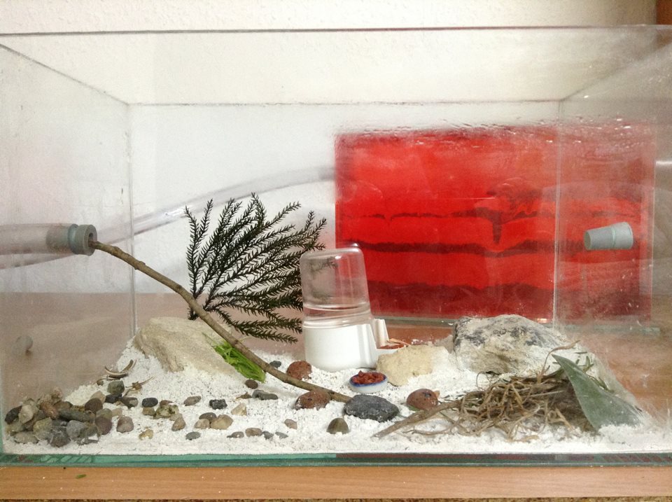 Die Ameisen sind um 12 Uhr Mittags gekommen ich habe direkt das RG mit roter Folie bedeckt (beklebt). Zunähst habe ich die Ameisen in einem duckelen Schrank untergebracht, und die Arena + dem Nest startbereit gemacht.