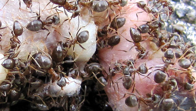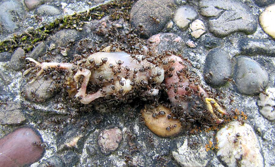 Die Gesundheitspolizei (Lasius niger) ist in Kompaniestärke angetreten. Aber die Leiche muss weg, sonst tritt noch einer darauf. :(