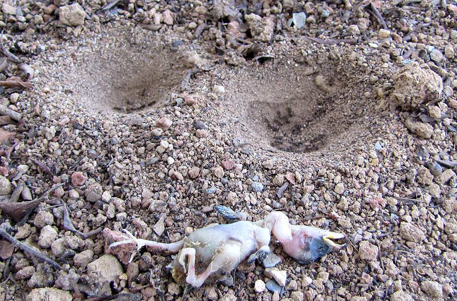 Daneben wohnt eine Gruppe von Ameisenlöwen. Für sie ist heute Feiertag: Ich habe den Spatz samt Ameisen mitten in das Trichterfeld gelegt!