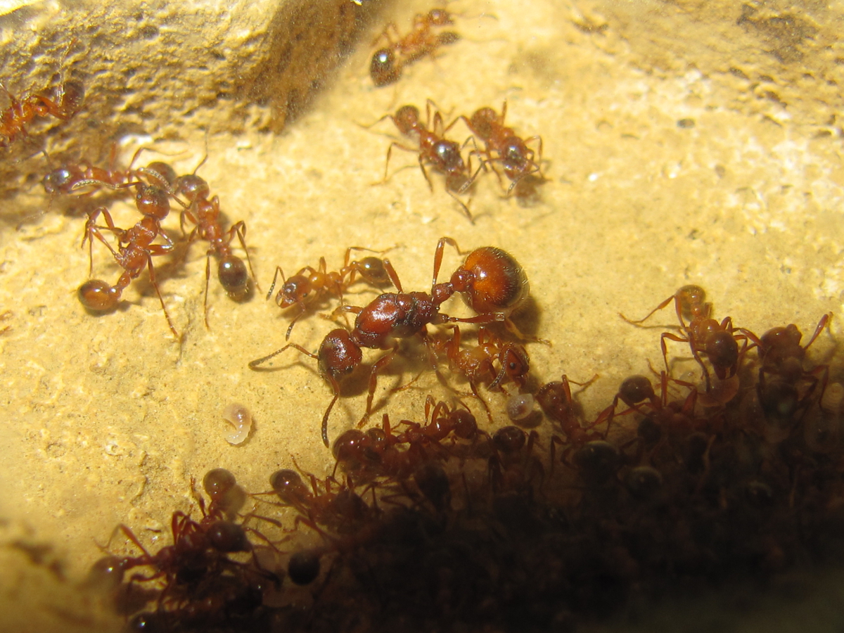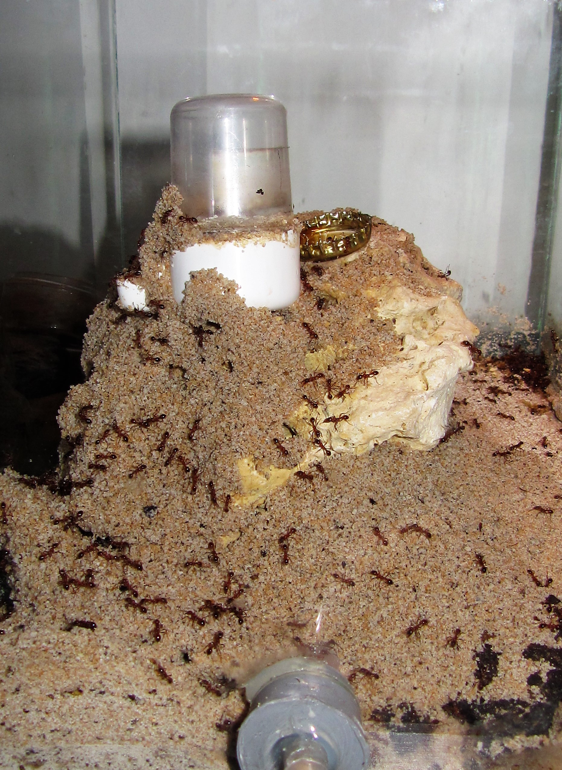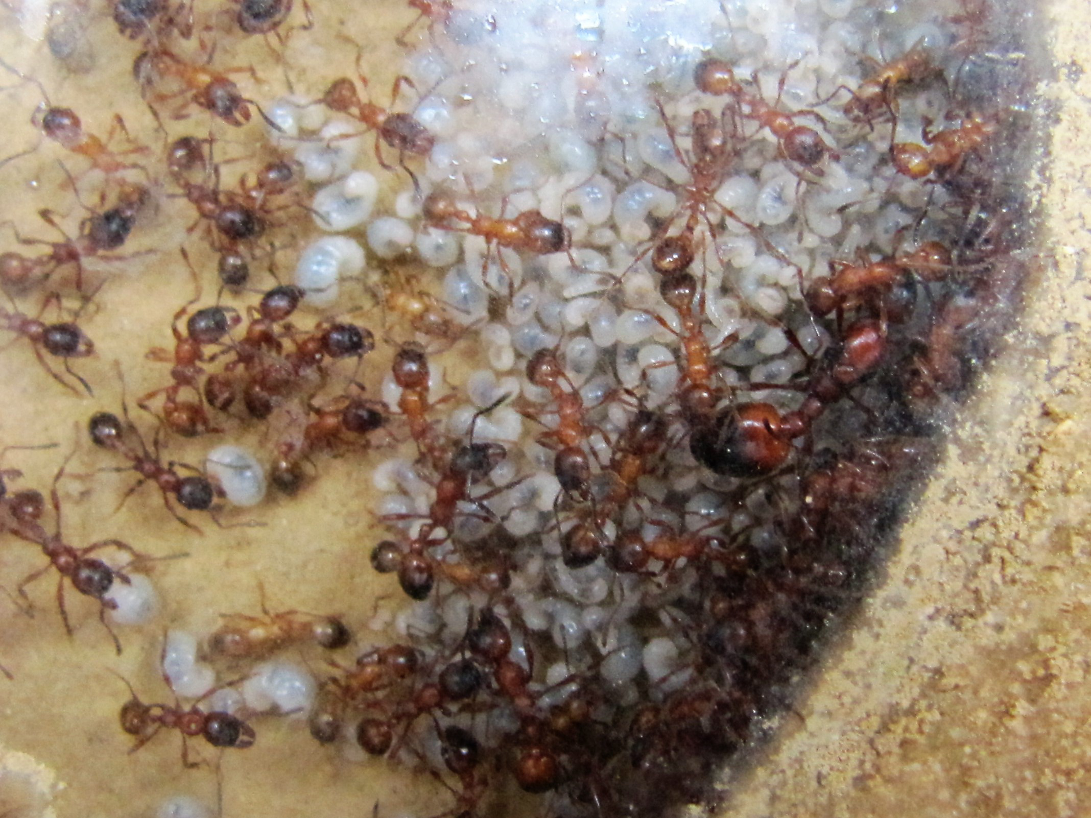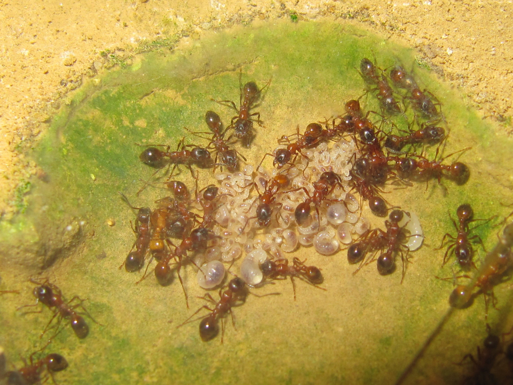 Die Manica rubida sind zurück aus der Winterruhe. Die Gyne lebt und viele Larven sind vorhanden, was aber - jetzt wo wieder Ameisen in der Arena furagieren - sofort ins Auge sticht: Es hat deutlich weniger Arbeiterinnen bzw. viel Platz im Nest! Die Winterverluste sind dem oben beschrieben Ausbruch verschuldet, zu anderen Verlusten, etwa durch Kälte oder Trockenheit ist es glücklicherweise nicht gekommen. Dennoch schätze ich, dass die Kolonie auf etwa 250 Tiere geschrumpft ist.