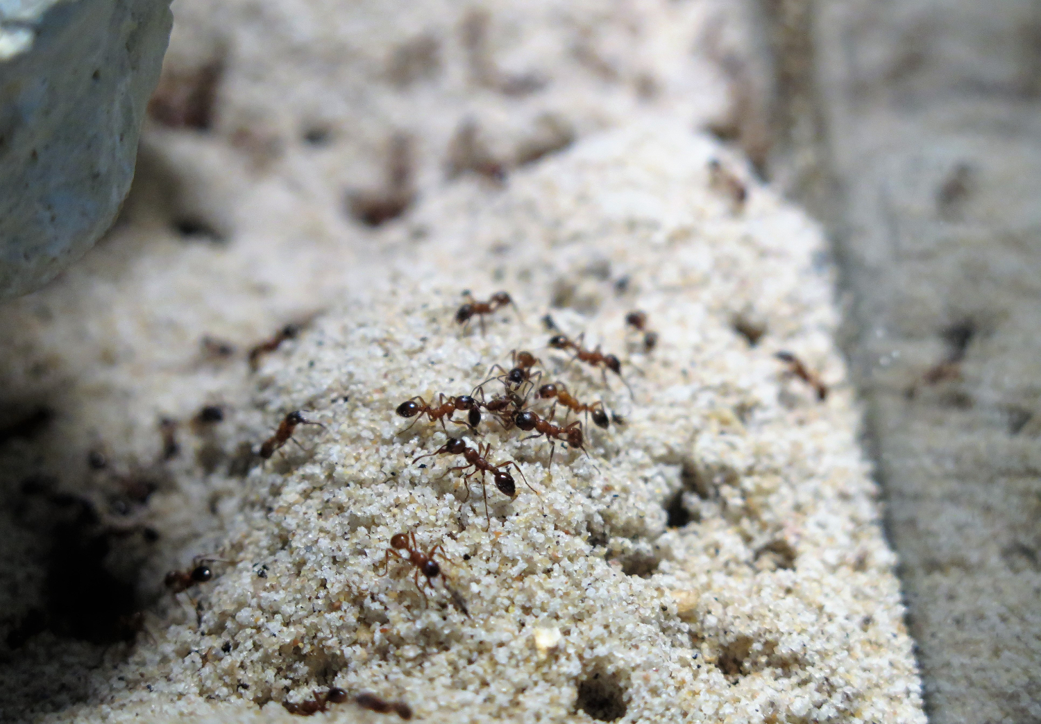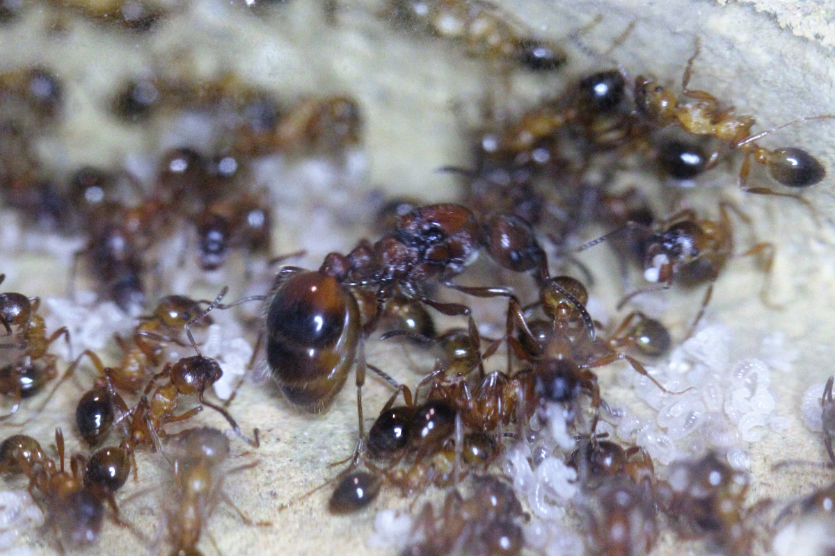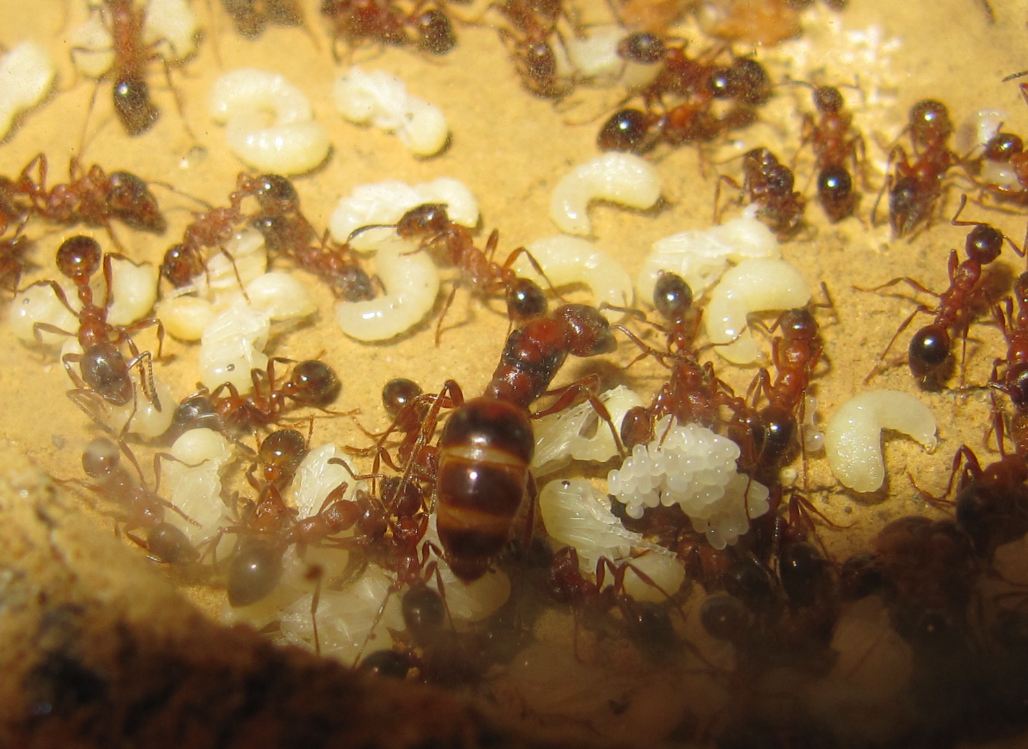 Die Manica rubida sind zurück aus der Winterruhe. Die Gyne lebt und viele Larven sind vorhanden, was aber - jetzt wo wieder Ameisen in der Arena furagieren - sofort ins Auge sticht: Es hat deutlich weniger Arbeiterinnen bzw. viel Platz im Nest! Die Winterverluste sind dem oben beschrieben Ausbruch verschuldet, zu anderen Verlusten, etwa durch Kälte oder Trockenheit ist es glücklicherweise nicht gekommen. Dennoch schätze ich, dass die Kolonie auf etwa 250 Tiere geschrumpft ist.