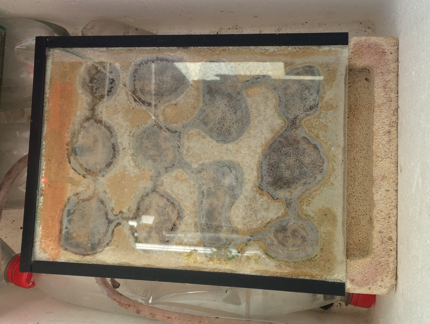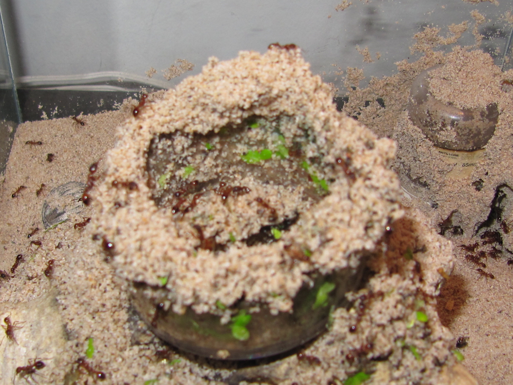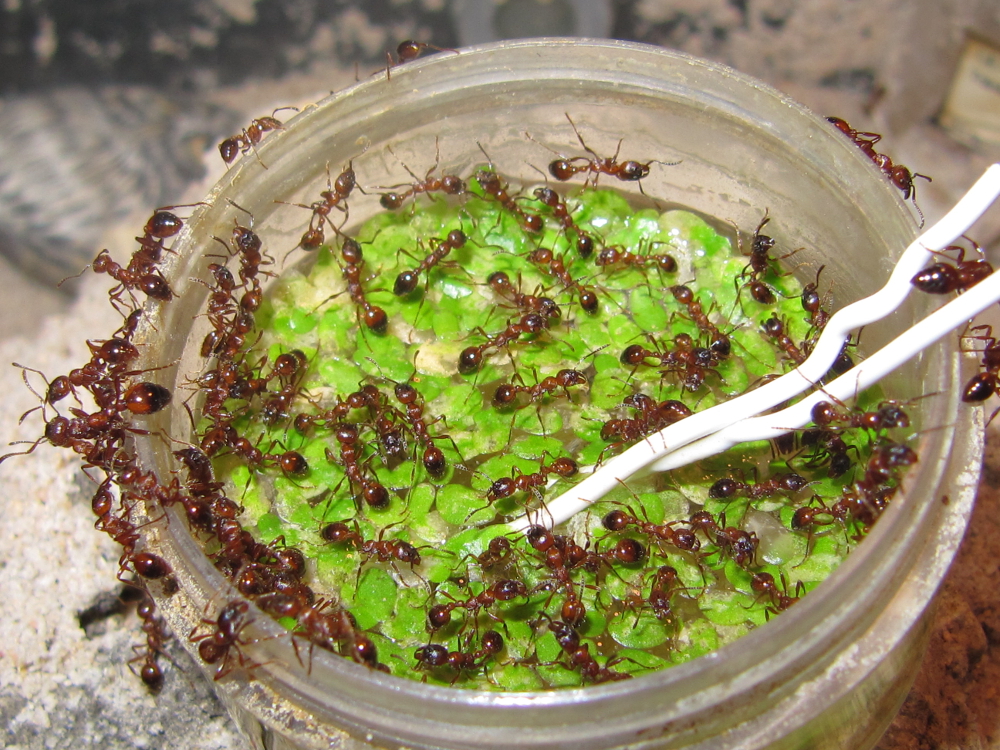Die Sache mit der Wasserlinsentränke habe ich ebenfalls in den Griff bekommen. Seit ich das entsprechende Becken überhaupt nicht mehr befeuchte, haben die Ameisen keine Gelegenheit mehr die Erde so aufzuschichten, dass die Tränke ausläuft. Die Ameisen lieben es, sich auf den Linsen aufzuhalten und zu trinken. Ein weiterer Nebenefekt der höchstwahrscheinlich durch die Tränke verurschat wurde: Im Nest bilden sich Algen. Diese dürften mit den Wasserlinsen aus dem Aquarium über die Beinchen der Ameisen ins stets feucht gehaltene Nest gelangt sein. Offenbar bekommen die durch die rote Folie genug Licht, um sich auszubreiten. Mich stören sie nicht.