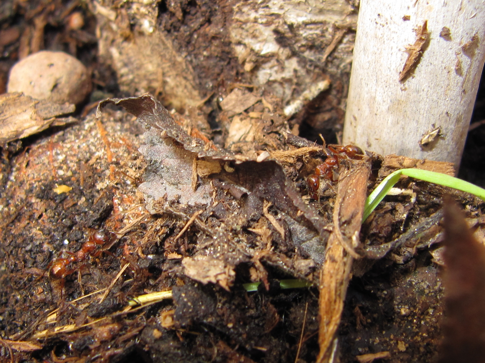 Ich liess die Verbindung also in der Hoffnung offen, dass die näher rückende Kaltfront das Problem erledigen würde und die Ameisen sich freiwillig ins Nest zurückziehen. Leider vergebens, bisher sank das Quecksilber auch nachts nicht unter 10°C und heute bemerkte ich, dass sich Manica-Arbeiterinnen in meinem Kirschbaumtopf ein Zweignest graben. Mittlerweile habe ich die Ausbruchsstelle am Nest abgesichert. Gyne und Brut befinden sich noch im YTONG-Nest. Allerdings habe ich jetzt hunderte von Ameisen auf dem Balkon und zwischen Styroporkiste und Kirschbaumtopf eine Strasse...