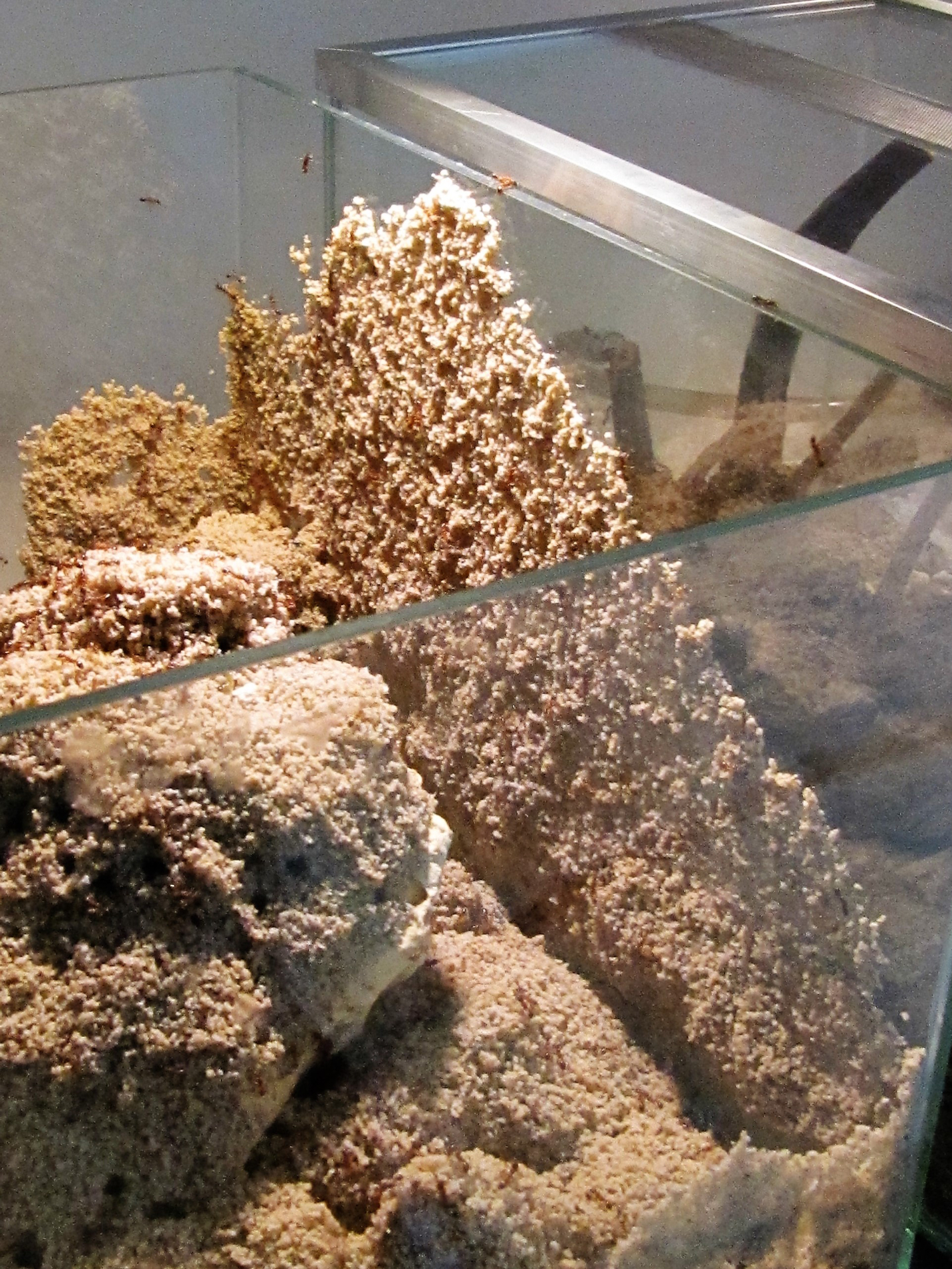 Das eigentliche Nest bestand hier aus dem üblichen Kunststoffrahmen, der aber anders als sonst üblich unten offen war, so dass diese Ameisen auf dem feucht gehaltenen Gips wohnten.