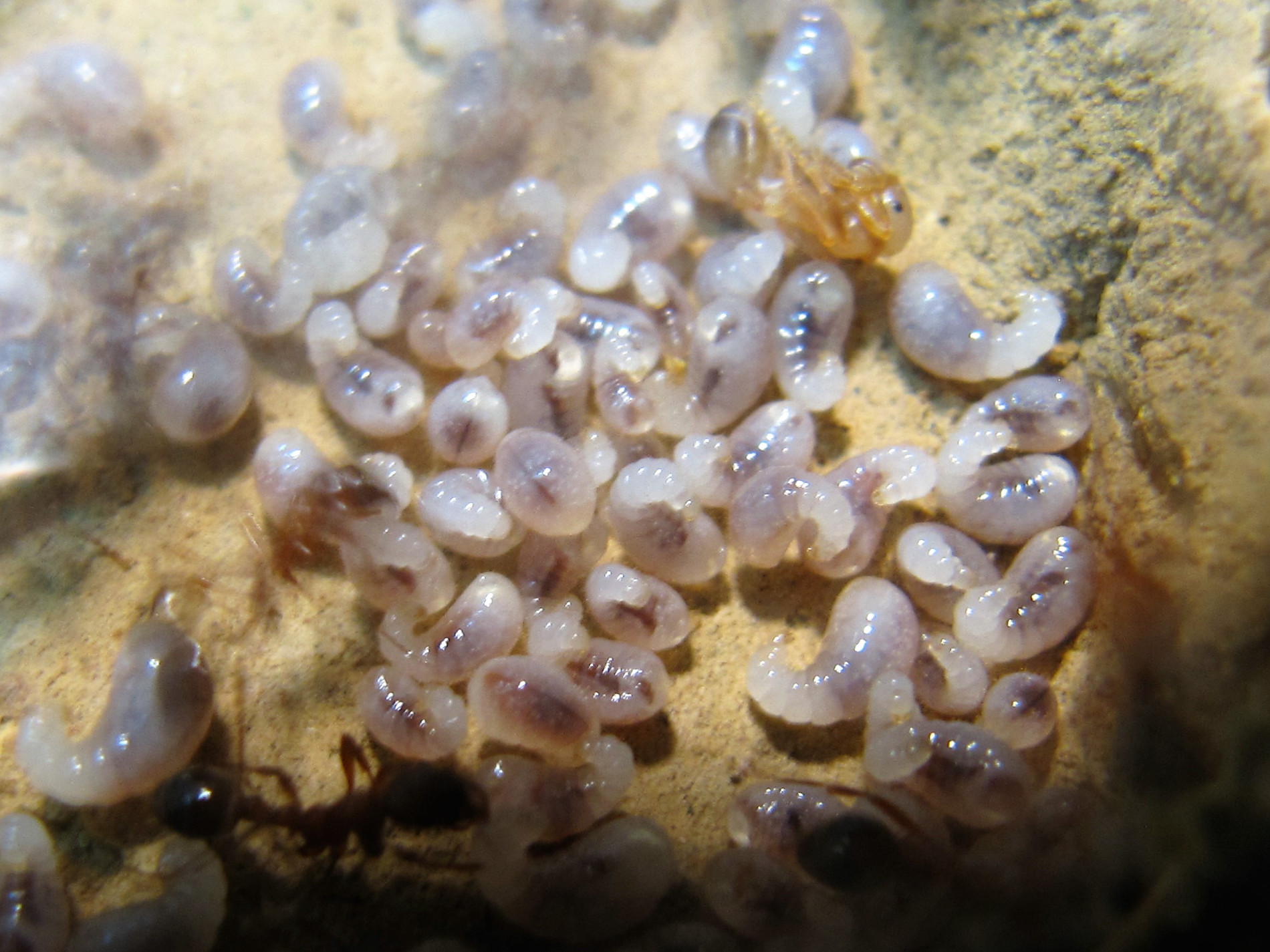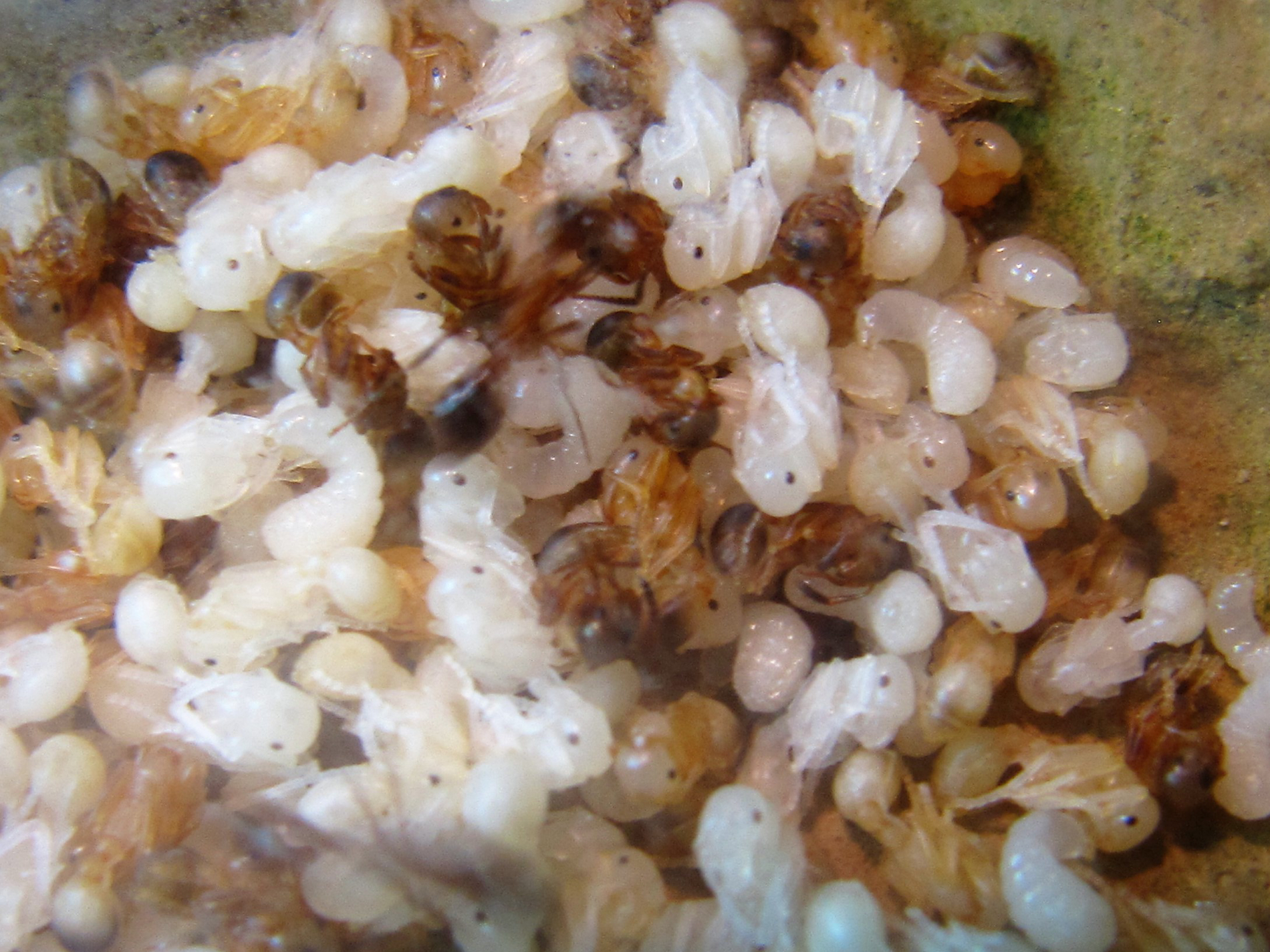Ja, gerade mal eine einzige Vorpuppe konnte ich im ganzen Nest noch entdecken. Eier sah ich keine mehr. Kleine und mittelgrosse Larven gibt es noch sehr viele.