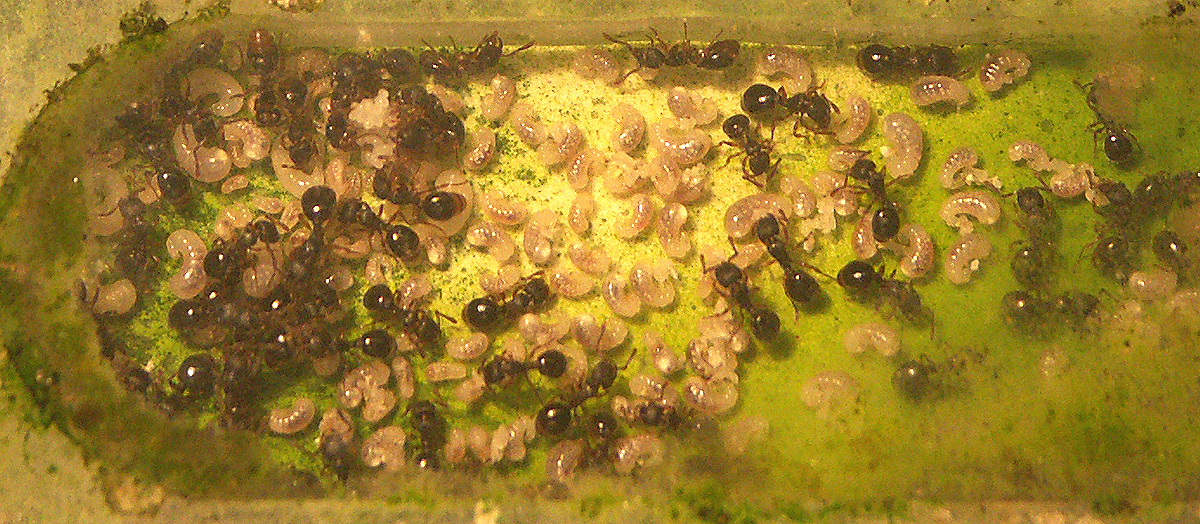 Es gibt keine Eier mehr und die Gyne ist nicht mehr physogastrisch (siehe unten und zum Vergleich). Die Aussenaktivität ist geringer, aber nach wie vor recht hoch. Puppen sind noch einige vorhanden, Larven hat es viele.
