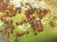 Ansonsten gibt es nichts auffälliges zu berichten. Es gibt viel Brut, die nach Entwicklungszustande bzw. nach Larvengrösse sortiert wird. Die Puppen haben weiterhin nur die durchnittliche Grösse. Einige der neuen Arbeiterinnen sind sogar kleiner als ihre älteren Schwestern, wenige sind etwas grösser. Im Durchschnitt sind die Arbeiterinnen der Kolonie ca. 6-7 mm lang und im Vergleich mit den Manica in der Natur wirken sie recht schmal.