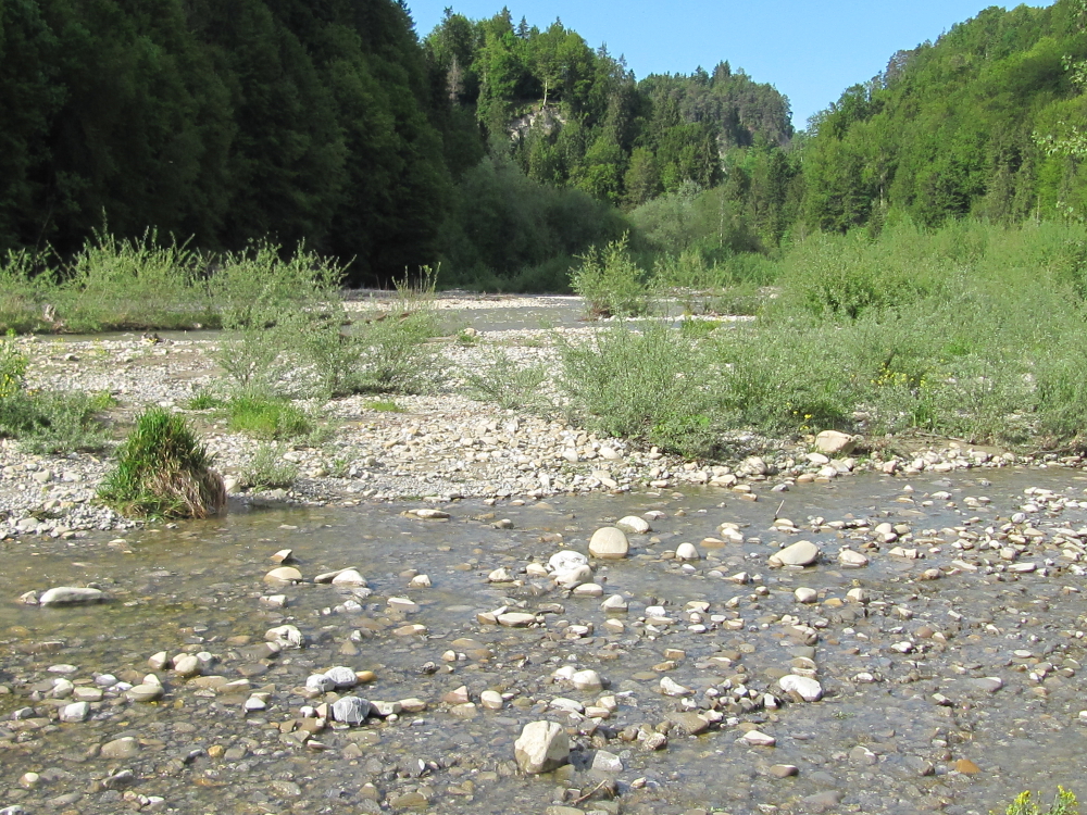 Anbei noch einige Fotos vom Fundort der Tiere bei der Sensebrücke: Dort gibt es mehrere Nester von Manica rubida, zum Teil in sehr kleinem Abstand zueinander und zu Nestern von anderen Arten. Erstaunlich - aber eben typisch - ist die Nähe und Dichte der Serviformica-Nester (vemutlich aus der cinerea Gruppe und nicht wie anfänglich von mir vermutet Formica cf. fusca) in dem Gebiet. Gründende Königinnen haben es hier auf jeden Fall nicht leicht. Zum Teil liegen die Nester nicht einmal 70 cm auseinander. Die Formica haben sich gegenüber den viel grösseren Manica auffallend aggressiv verhalten! Auch Myrmica sp. sind sehr häufig anzutreffen. Im vergangenen Sommer konnte ich breite und lange Strassen beobachten. Heuer war davon nichts zu beobachten (wohl noch zu früh). Das Gelände hat einen sandigen, manchmal lehmigen Untergrund und ist von Bächlein und Tümpeln durchzogen. Immer wieder erheben sich Kiesbänke im Gelände. In der Mitte fliesst die Sense (angeblich der naturbelassenste Fluss im Alpenraum) in ihrem steinigen Bett. Ach ja, Gelbbachunken sind mir natürlich keine begegnet...