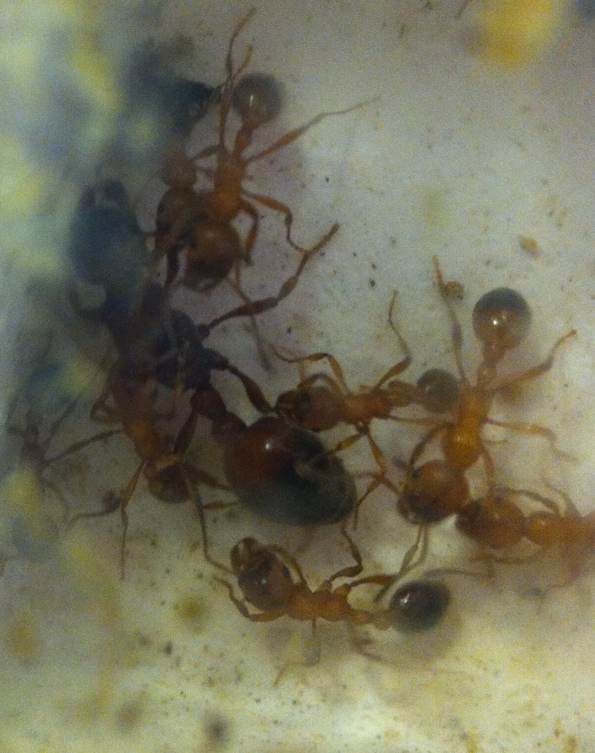 Edit 2: 22.00 Uhr: Die Gyne ist jetzt umringt von Arbeiterinnen, zwei hocken sogar friedlich auf ihr drauf, es sieht ein wenig aus wie bei Atta. Ich nehme das Nest jetzt aus dem Kühlschrank und beobachte die Situation. Ich hoffe der Koloniegeruch hat sich inzwischen angeglichen und das Tier wird angenommen.