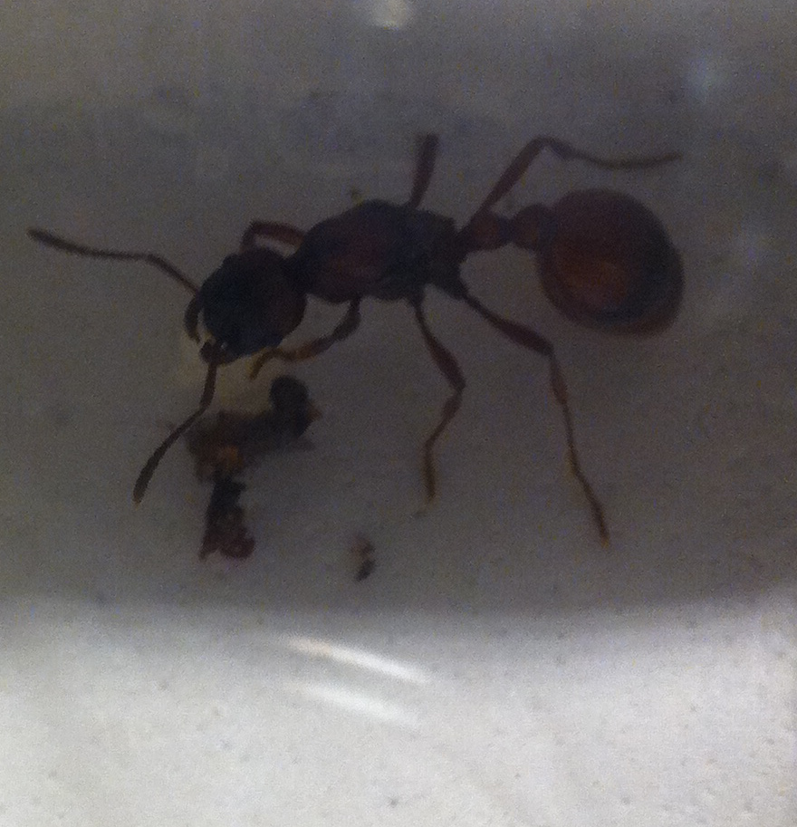 Kaum vom Auto weg, begegent mir auf dem Kiesplatz schon die erste Ameise – eine Manica rubida Königin. Das gibts doch nicht! Die ist natürlich sofort im Einmachglas gelandet. Kurze Zeit später, sind mir noch weitere über den Weg gelaufen, es musste also ein Schwarmflug stattgefunden haben. Obwohl ich noch ein Päckchen vom Händler erwarte, habe ich eine weitere Gyne mitgenommen. Eine will ich normal gründen lassen, mit der zweiten Königin will ich einen Adoptionsversuch wagen.
