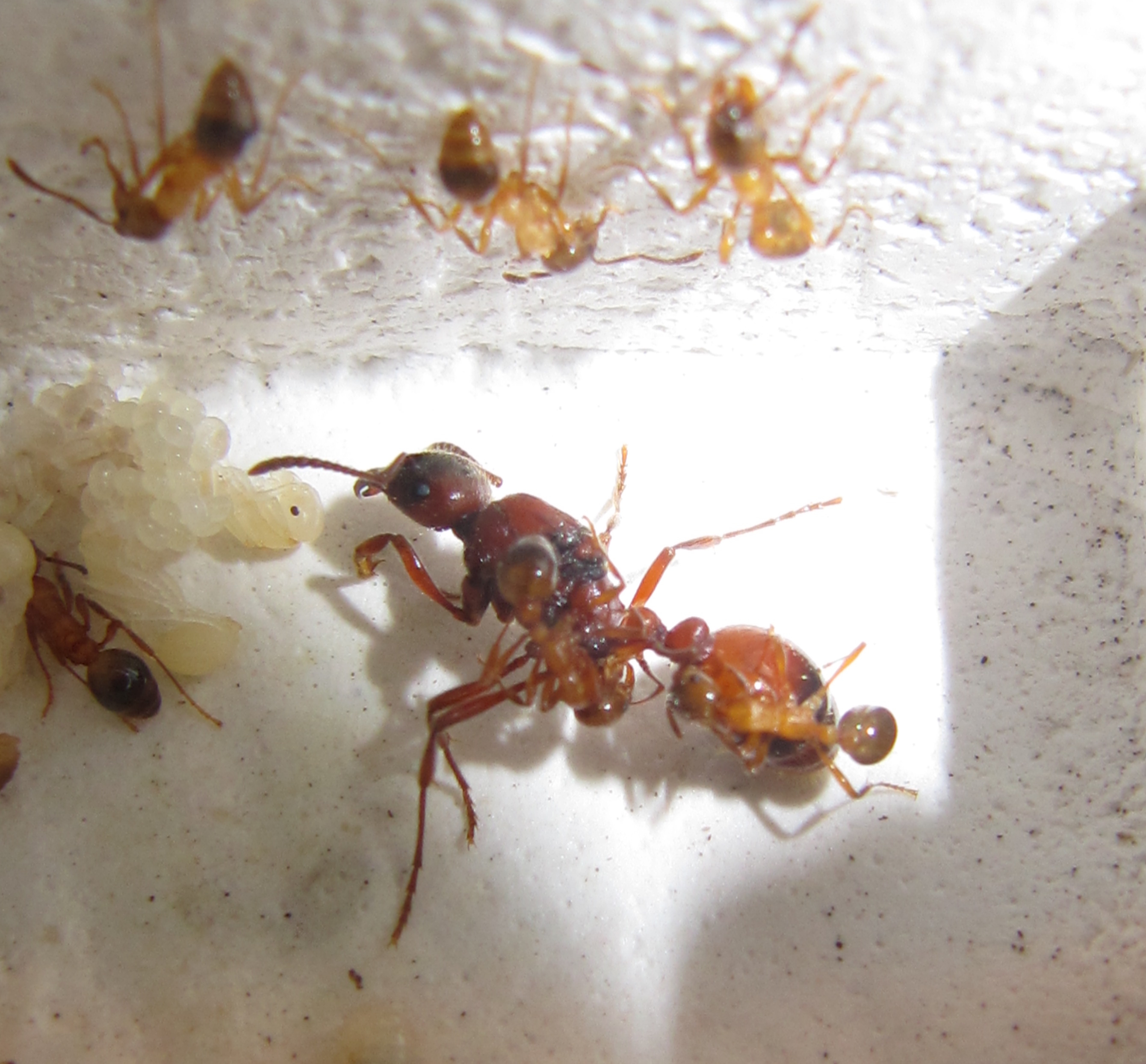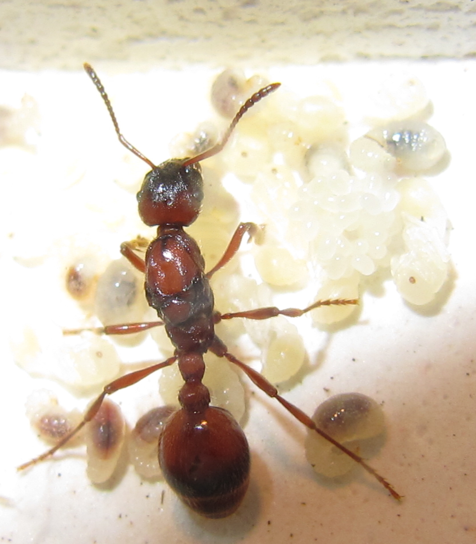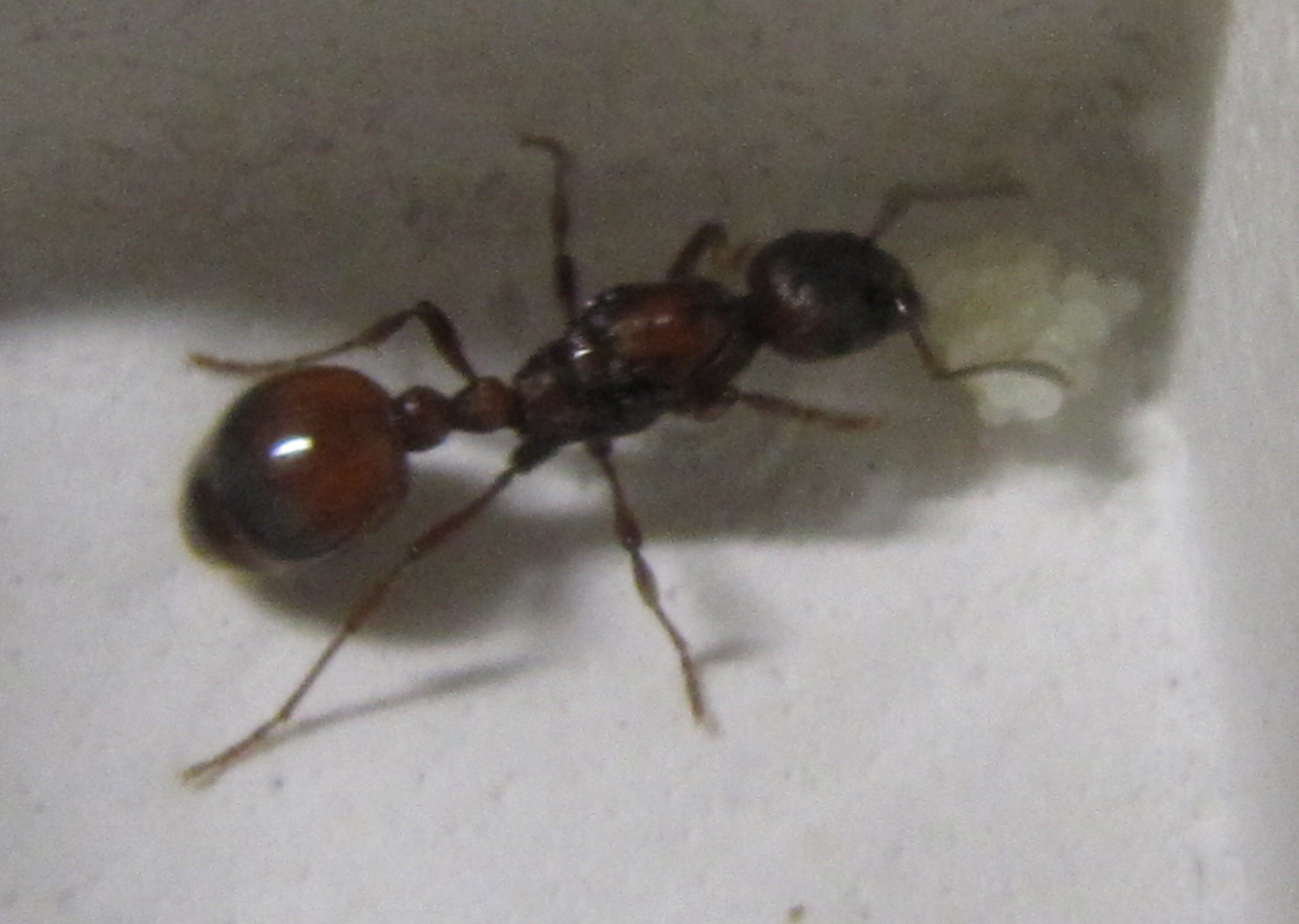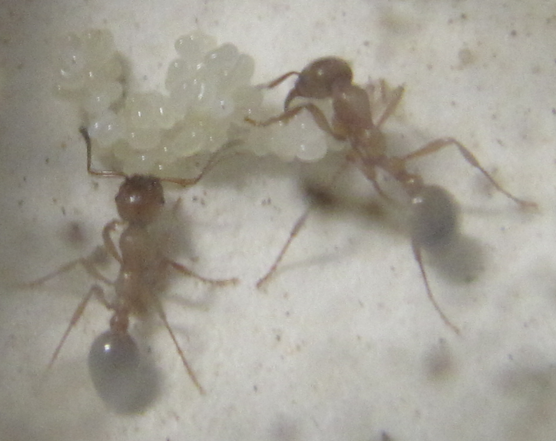 Die Königin ist oft im kleinen Nest und in der Arena unterwegs, ich konnte nicht entdecken, dass sie die verlorenen Eier eingesammelt hätte. Das ist auf weissem Untergrund aber auch nicht ganz einfach zu erkennen, wenn man nicht zu lange stören will. Immerhin hat sie schon drei kleine Fruchtfliegen gefressen.