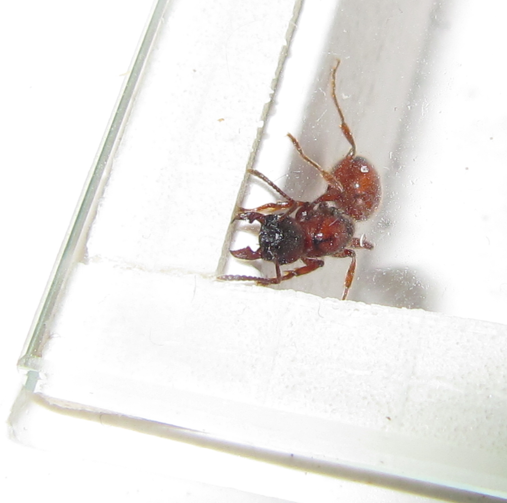 In früheren Jahren, konnte ich Adoptionserfahrungen bei Myrmica cf. rubra sammeln (bei normalen Temperaturen). Bei der „kleinen Schwester“ von Manica rubida ging das jeweils so ab: Hatte eine neue Gyne die ersten Arbeiterinnen der Kolonie gesehen, versuchte sie sofort zu flüchten. Umgekehrt versuchten die Arbeiterinnen sogleich die Königin zu „fixieren“, also fest zu halten (meist am Stielchen oder an den Beinen) ohne aber den Stachel einzusetzen. Die Königinnen wurden relativ lange von vielen Arbeiterinnen festgehalten. Nach ein bis zwei Tagen waren die Gynen dann entweder akzeptiert – oder Tod, was leider auch vorkam.