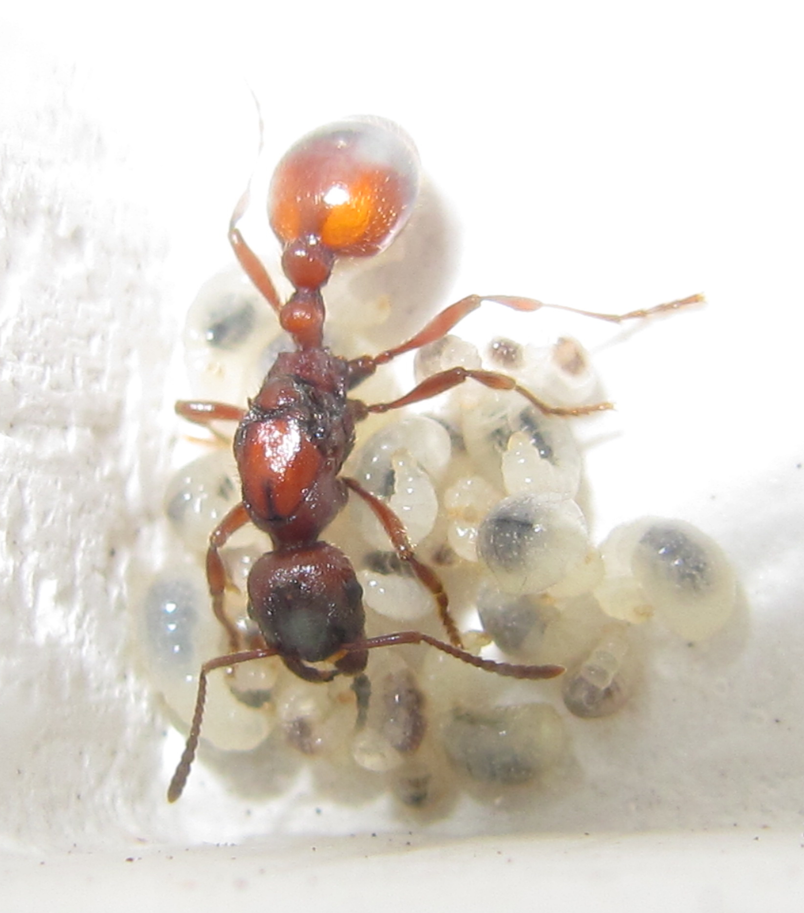 Adoptionsversuch bei kleiner weisellosen Manica rubida KolonieDie Gyne, die ich für die Adoption vorgesehen und deshalb in ein Reagenzglas gesteckt habe, hat bereits am Samstag mit der Eiablage begonnen: Von jetzt an hier