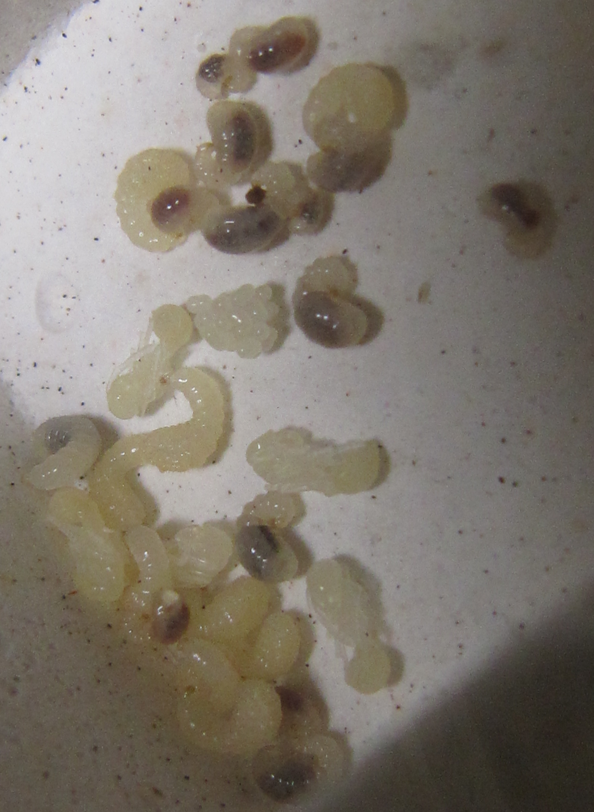 Nach 26. Tagen gibt es bereits erste Larven! Die Temperatur beträgt in der Regel 25 C° am Tag und ca. 20 C° in der Nacht. Zwischenzeitlich war es aber einige Grad wärmer. Ich füttere jetzt wieder täglich kleine Mengen Proteine.