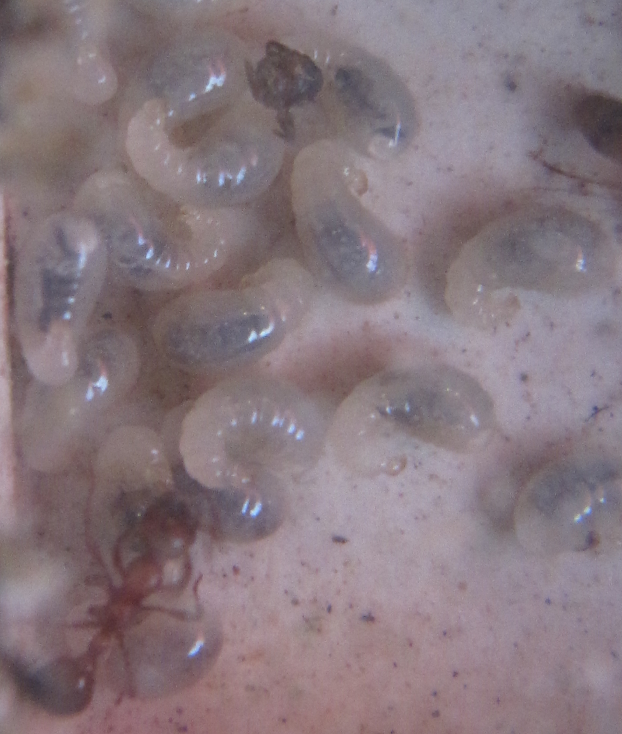 Kolonie B ist mit deutlich weniger Futter zufrieden. Am Zucker- oder Honigwasser kann ich die Gyne nie beobachten. Dafür werden Fruchtfliegen und Mini-Heimchen sofort eingetragen und verfüttert. Es gibt jetzt ca. 25. Larven, die sich mittlerweile in der Grösse deutlich unterscheiden.