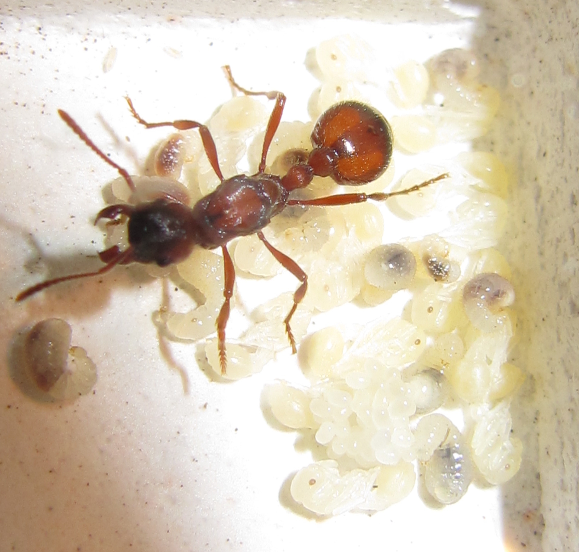 So, nun gibt es auch bei "Kolonie" B die ersten kleinen Puppen. Zudem hat die Gyne neue Eier gelegt und es gibt nun Brut in allen Stadien. Hier im Bild ist Mutti grad aus dem Haus, besser aus dem Häuschen - ich habe die Glasscheibe der Mini-Arena etwas unsanft aufgesetzt, etwas dass die Gyne überhaupt nicht verträgt. Nach Erschütterungen sucht sie sofort alle Kammern und sogar die Arena ab. Aber die Gute ist nicht nur mutig, sondern auch ordentlich: Während andere Königinnen von Manica rubida die Überreste von toten Futtertieren zum abdichten des Nestes brauchen, bringt Gyne B sie schön raus in die Arena und versteckt sie sauber hinter dem Honigwasserschälchen. Fast reut es mich, das gute Tier weiterzugeben ;) Aber sie kommt in gute Hände!