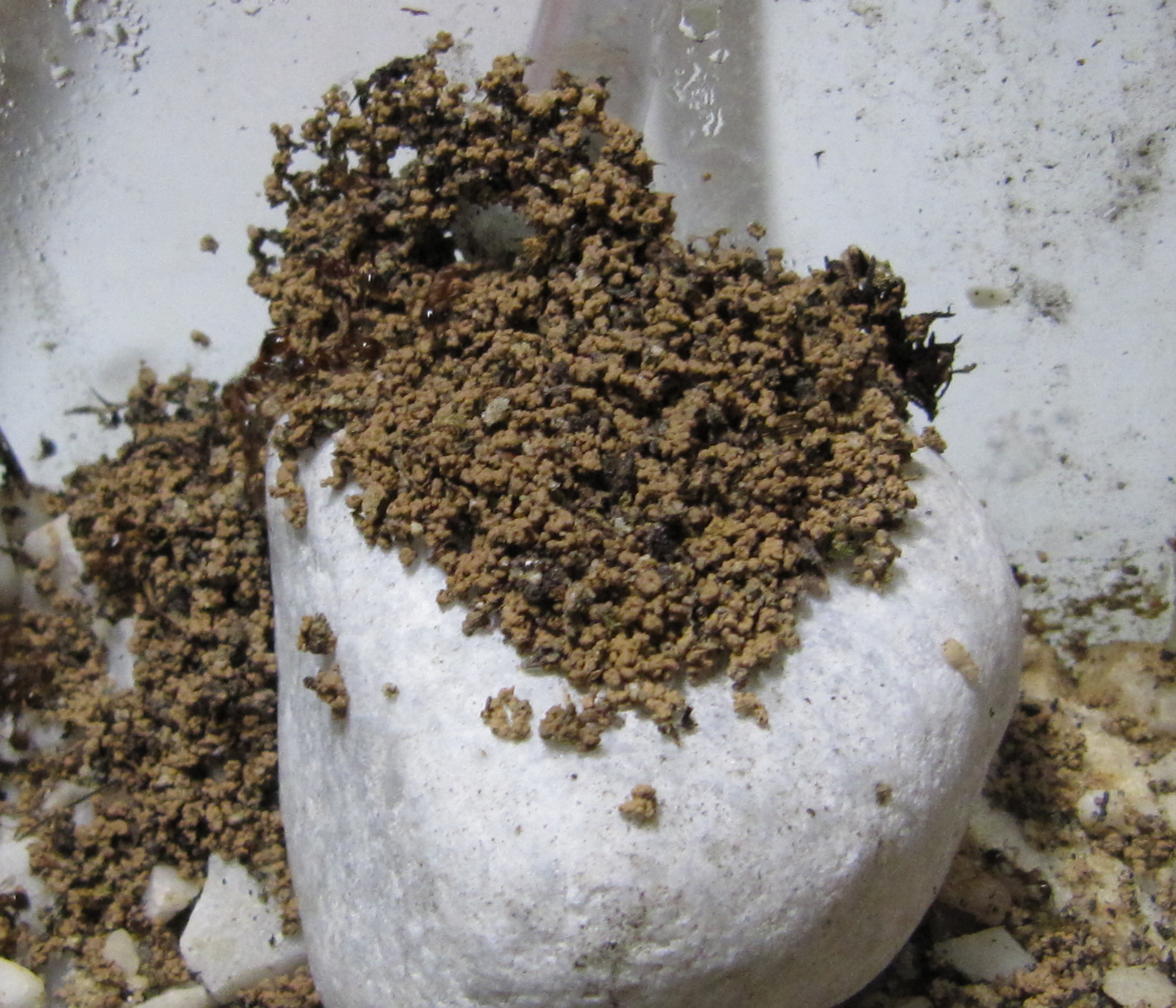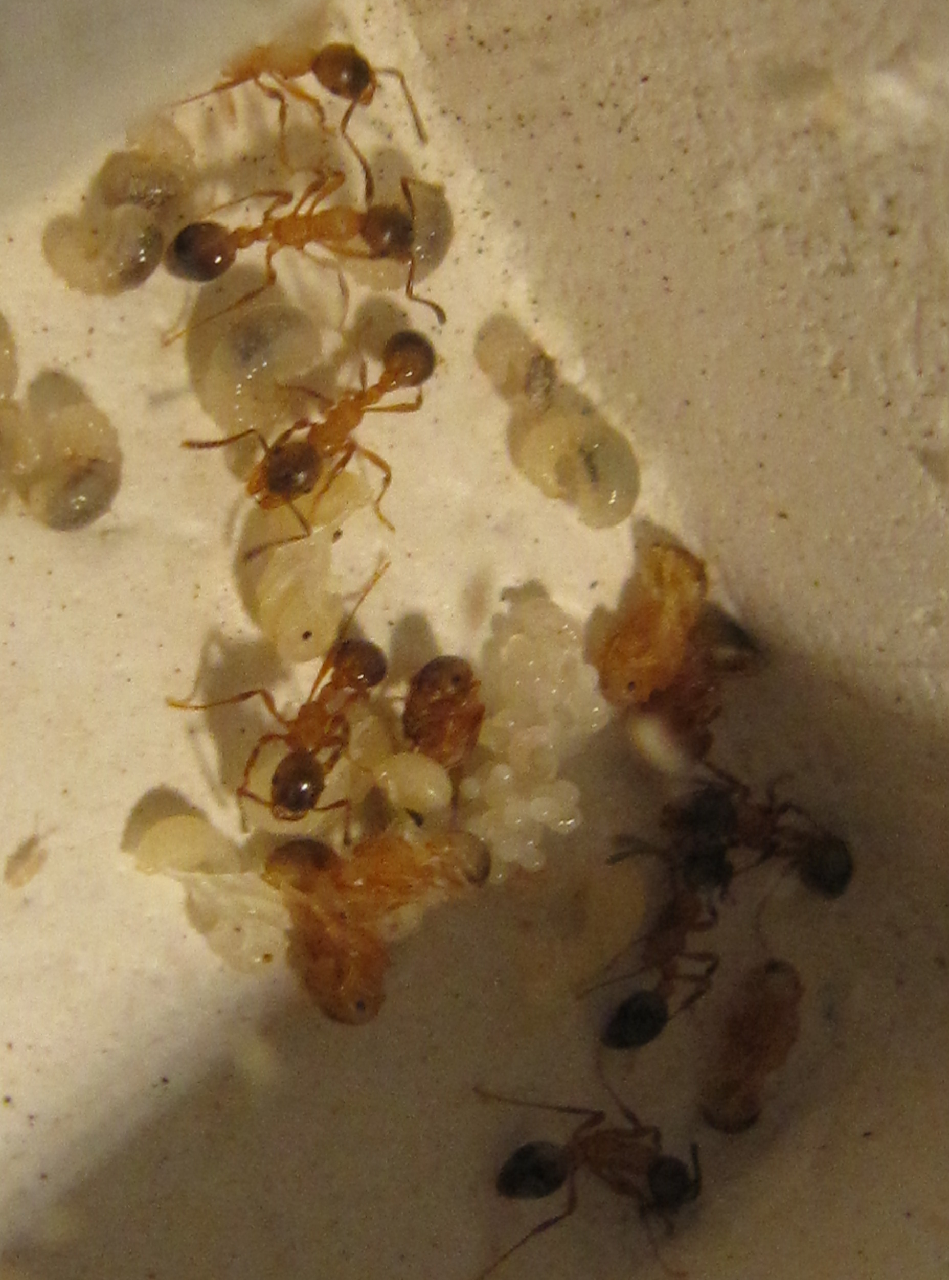Ganz anders als bei allen anderen Ameisen die ich halte, sind bei den Manica rubida noch keine Anzeichen einer bevorstehenden Winterruhe vorhanden. Sie stehen jetzt seit einer Woche auf der Fensterbank (tagsüber 18-20 C°, nachts 15 -17 C°) und im Nest kann ich mehr Puppen als Larven erkennen (ca 50.), auch einige Eipakete sind noch vorhanden. Futterinsekten werden sofort eingetragen. Es wird also höchste Zeit: Die Tiere kommen noch im Verlauf dieser Woche in die Styroporkiste auf dem Balkon. Ich hoffe, dass ein guter Teil der Puppen noch schlüpfen kann, bevor der Winter einbricht. Aber wenn ich die Tiere jetzt nicht nach draussen bringe, werden sich immer neue Larven verpuppen...