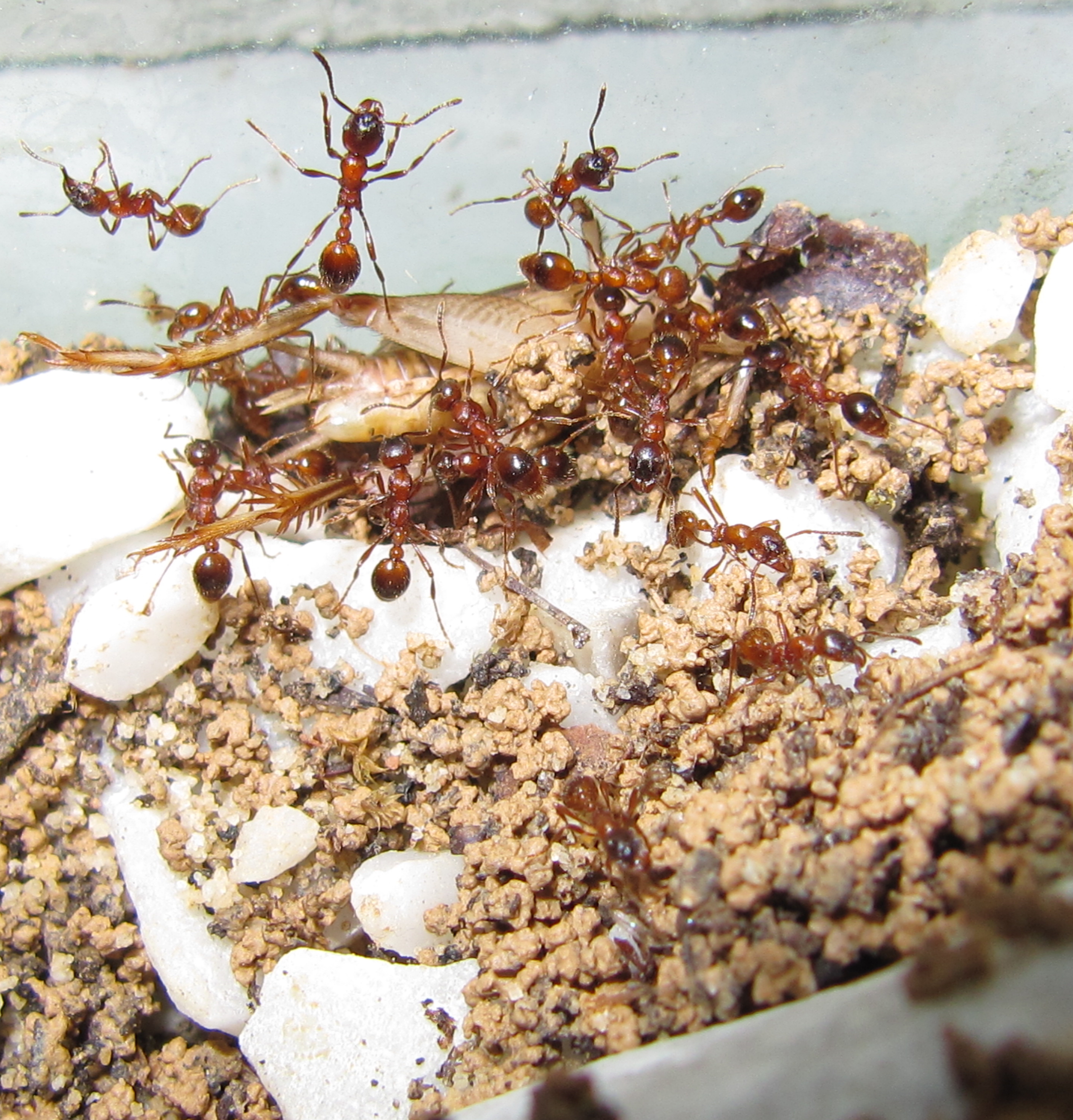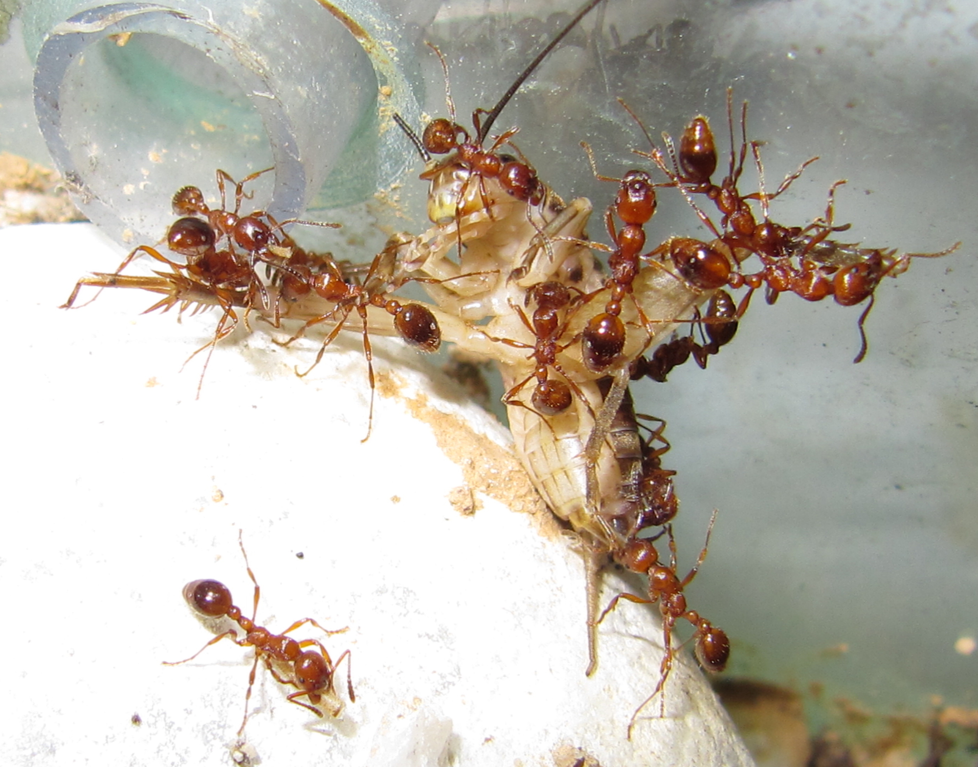 Glücklichwerweise ist der Verlust verkraftbar und es sind weitere Ameisen geschlüpft. Mittlerweile krabbeln 12 Stück durch die Gänge und Kammern. Die jungen Manica-Arbeiterinnen mögen noch "grün hinter den Ohren", bzw. "gelb am Mesosoma" sein. Schreckhaft sind sie nicht! Die erste Begegnung mit einer 1.5 cm grossen Steppengrille, beim vielleicht ersten Rundgang in der Arena verläuft, als wäre eine altgediente Aussendienstmitarbeiterin am Start: Sofortiges zupacken, zerren in Richtung Nesteingang, Verstärkung holen, gemeinsames Eintragen der Beute... Bei Pygmäen von Camponotus ligniperdus konnte ich in der gleichen Situation mehrfach ein erschrecktes Zurückweichen und anschliessendes Trommeln mit der Gaster beobachten...