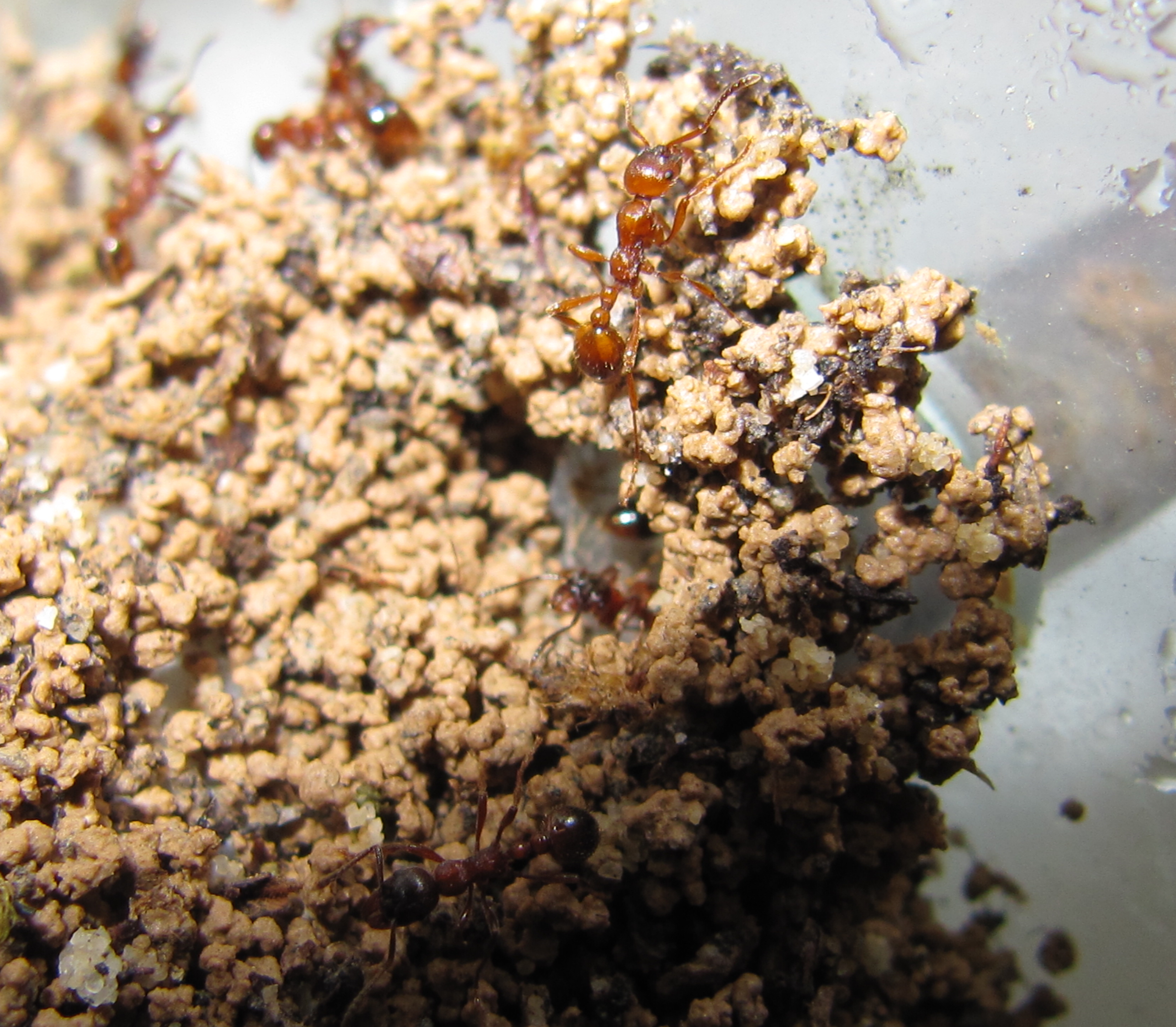 Manica rubida liebt es zu graben und zu bauen, das kann man schon bei kleinen Völkern feststellen. Wenn geeignetes Material vorhanden ist, wird es sofort genutzt, um Spalten im Nest abzudecken und wenn es der Bodengrund zulässt, legen die kleinen auch in der Arena gerne Gänge an.